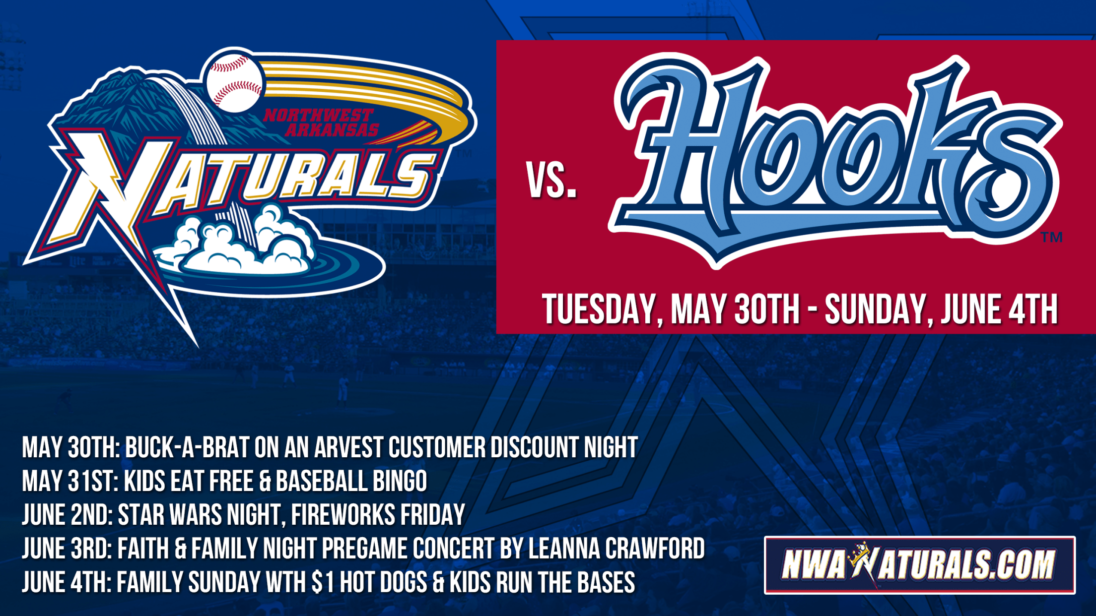SPRINGDALE, Ark. – The Northwest Arkansas Naturals return to Arvest Ballpark on Tuesday, May 30th for a six-game series against the Corpus Christi Hooks (Double-A Houston Astros). The upcoming series begins with Buck-A-Brat on an Unused Ticket Day and features daily food and drink specials while the weekend is highlighted by Star Wars Night on a Fireworks Friday and Faith & Family Night on Saturday.