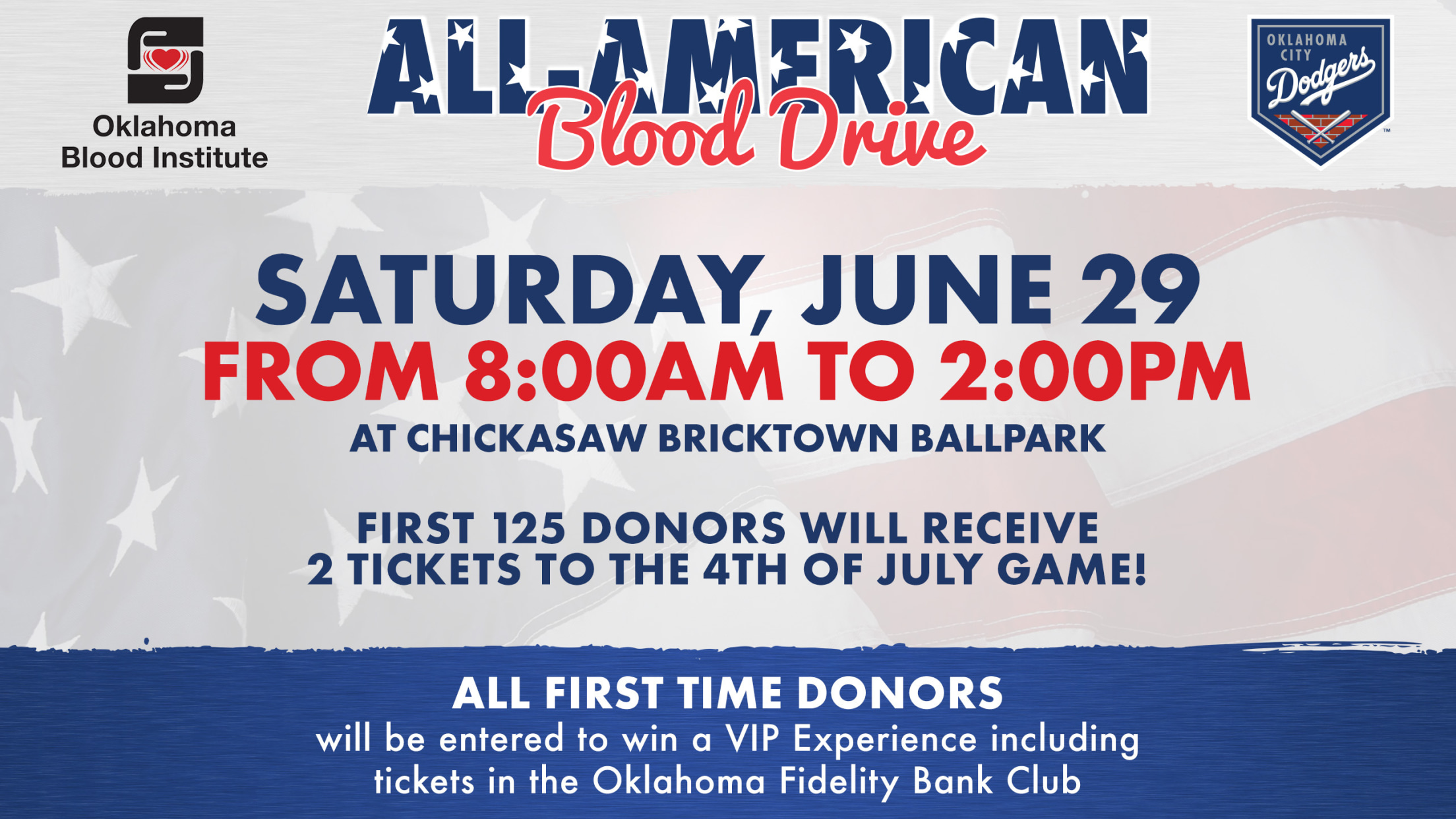 OKLAHOMA CITY - The Oklahoma City Dodgers and Oklahoma Blood Institute team up to host the annual All-American Blood Drive from 8 a.m. - 2 p.m. Saturday at Chickasaw Bricktown Ballpark. The All-American Blood Drive is held each summer at Chickasaw Bricktown Ballpark to help boost the supply of blood available in