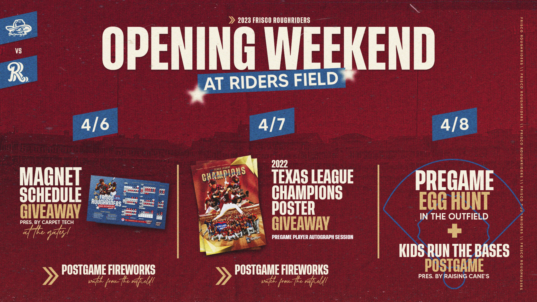 FRISCO, Texas (March 30, 2023) – Returning to the diamond after their Texas League Championship season, the Frisco RoughRiders open their 20th year in franchise history with a bang, April 6th through 8th. Opening Weekend at Riders Field is sure to be a memorable three days with fireworks, giveaways, special appearances and more!
