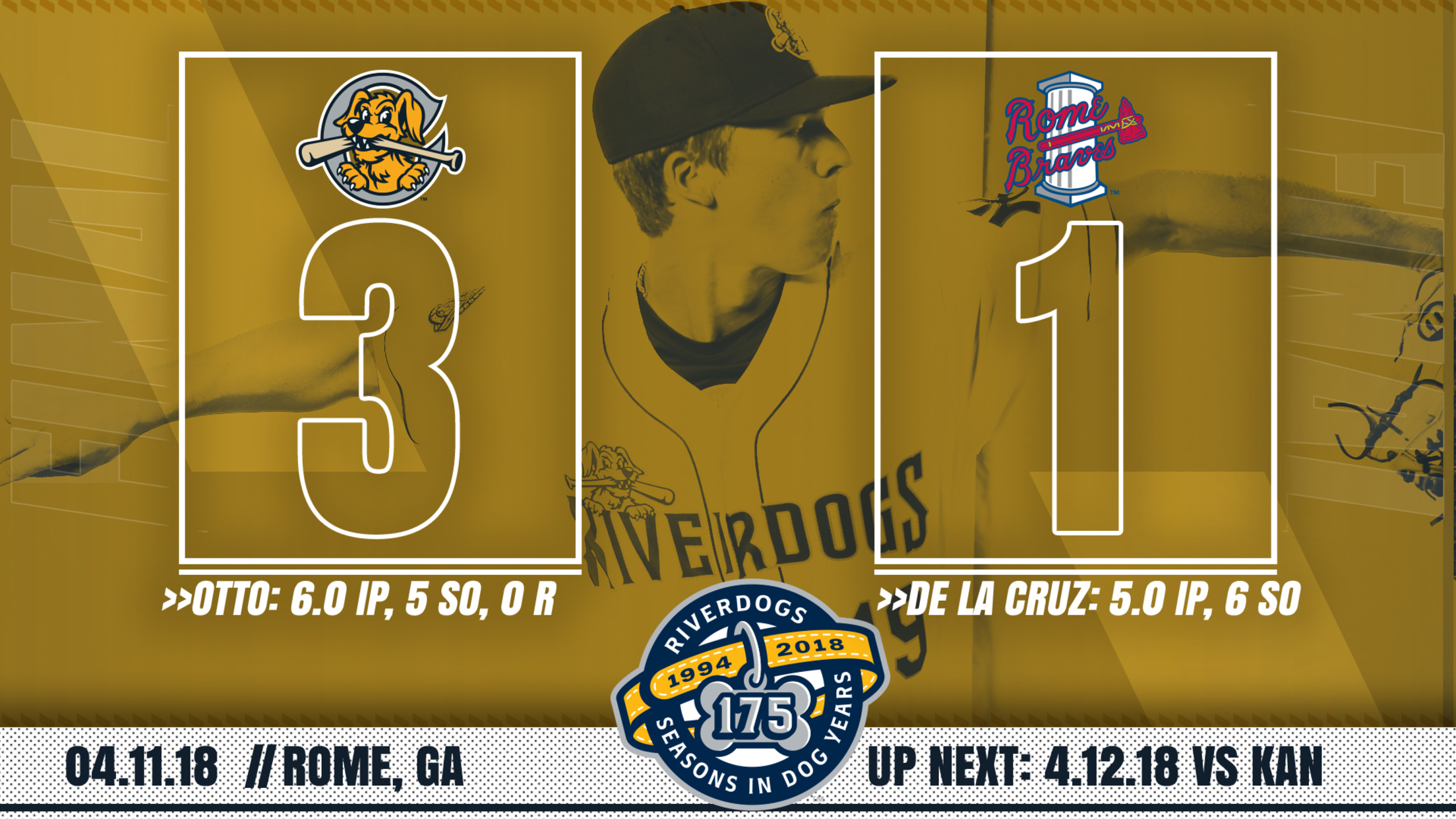 The win secures a 3-4 road trip to open the season for the RiverDogs, who return to Riley Park for their home opener on Thursday night against Kannapolis.
