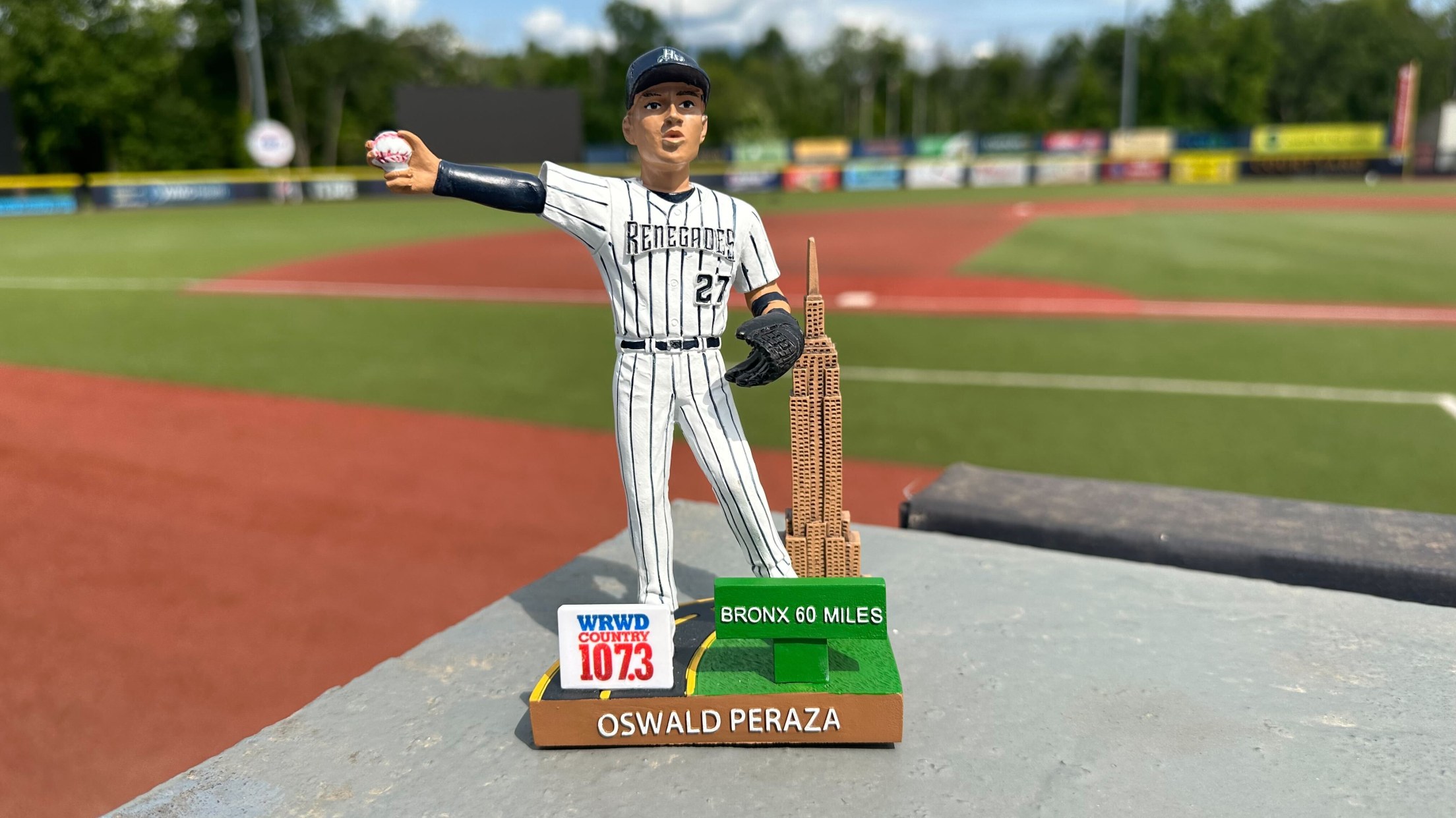 Wappingers Falls, N.Y. (June 9, 2023) – On Thursday, June 15, the Hudson Valley Renegades will give away a one-of-a-kind Oswald Peraza bobblehead to the first 1,000 fans through the gates at Heritage Financial Park before the team’s 7:05 p.m. game with the Rome Braves. The bobblehead is sponsored by WRWD. Gates at Heritage Financial Park open at 5:30 p.m. for Renegades Season Ticket Members, and 6 p.m. for all ticketholders.
