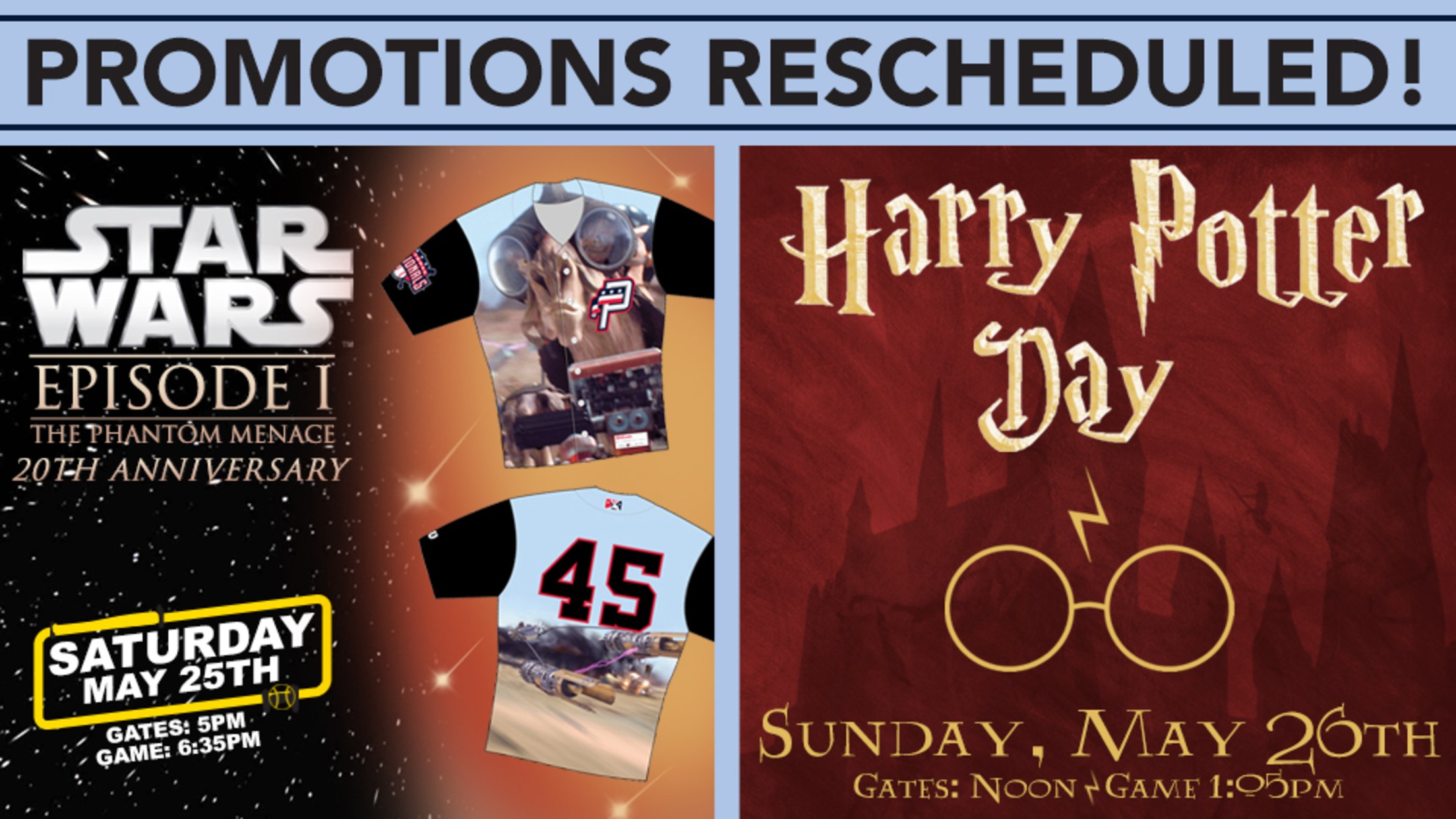 Saturday night's Star Wars Night will now be part of Potomac's game vs. the Frederick Keys (Baltimore Orioles) on Saturday, May 25th, while Harry Potter Day will follow one day later on Sunday, May 26th.