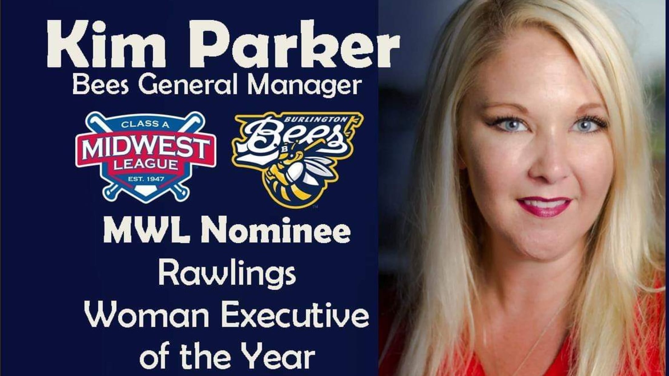 Burlington, IA - The Midwest League announced its nominees for Minor League Baseball's post-season awards, on Wednesday morning, naming Burlington Bees General Manager, Kim Parker, this year's recipient of the Midwest League Rawlings Woman Executive of the Year Nominee, as voted on by league general managers.The Rawlings Woman Executive of