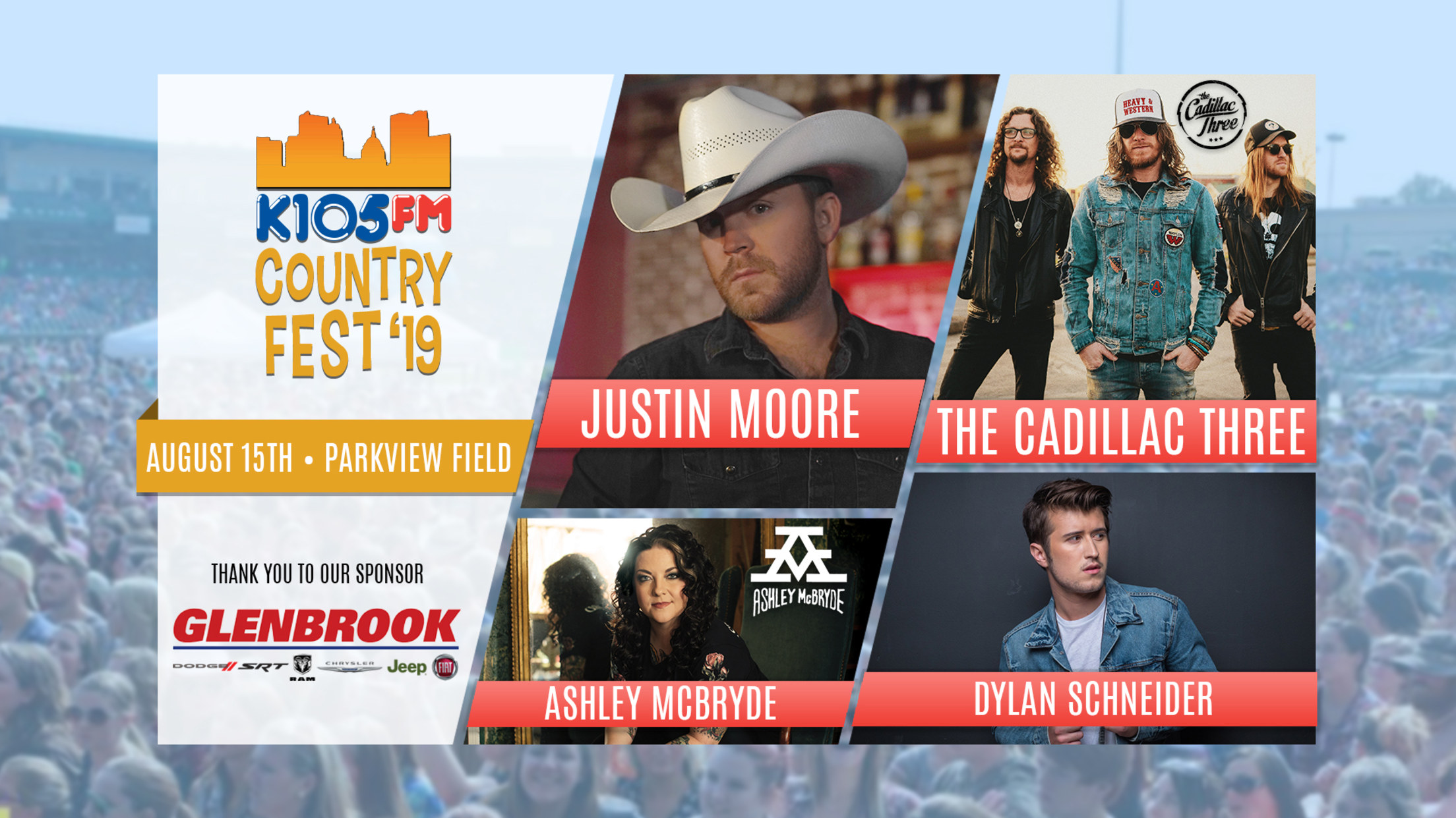 FORT WAYNE, Ind. - On Thursday night Parkview Field will host the K105 Country Fest, headlined by Justin Moore and featuring The Cadillac Three, Ashley McBryde, and Dylan Schneider. The show starts at 6:30 p.m. with doors open at 5 p.m. Tickets are available at parkviewfield.com and at the Parkview Field Ticket Office.