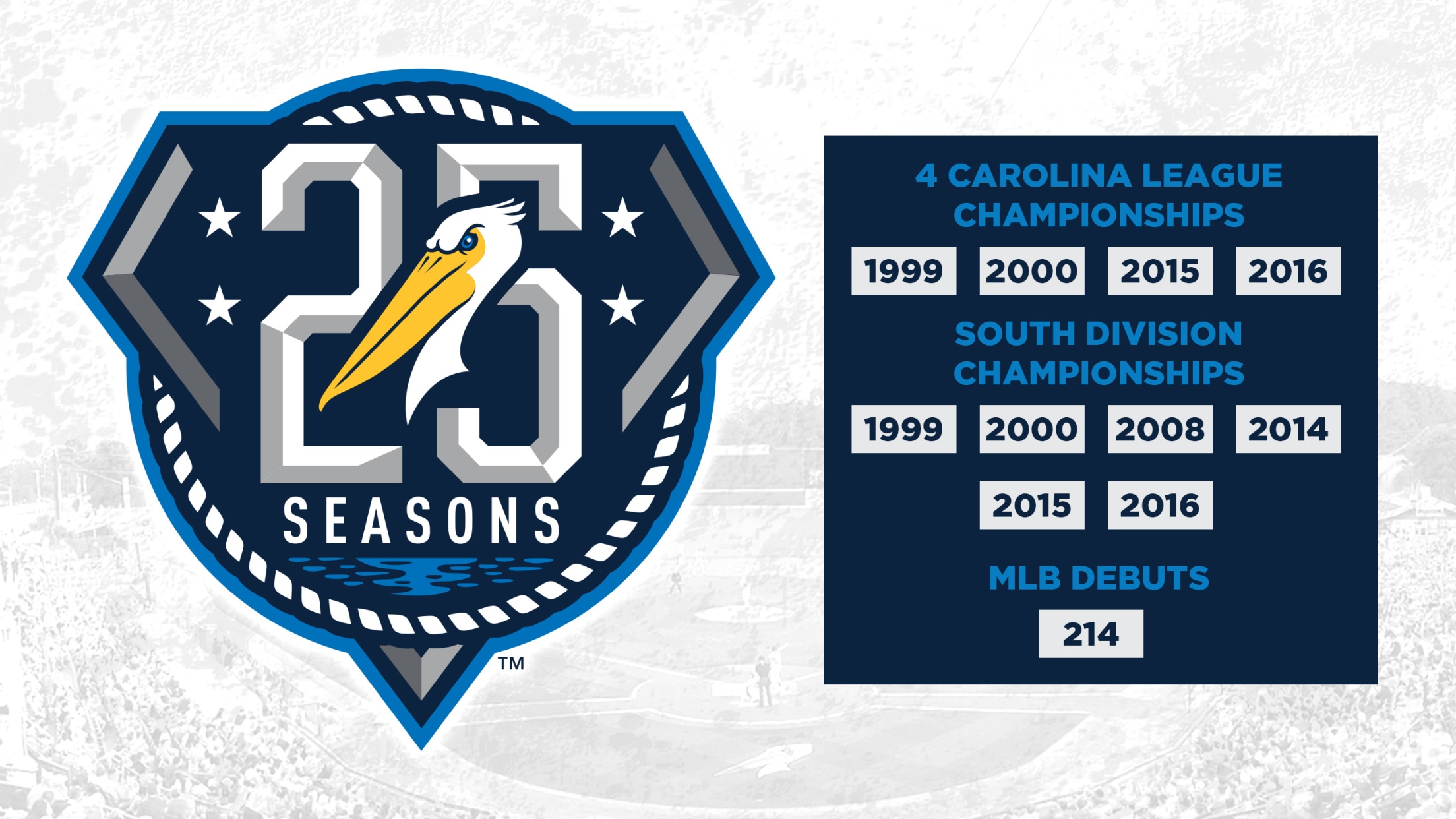 During the club’s tenure in Myrtle Beach, they have won four Carolina League Championships (1999, 2000, 2015, 2016), six South Division Championships (1999, 2000, 2008, 2014, 2015, 2016), and have seen 214 former Pelicans make their Major League debut.