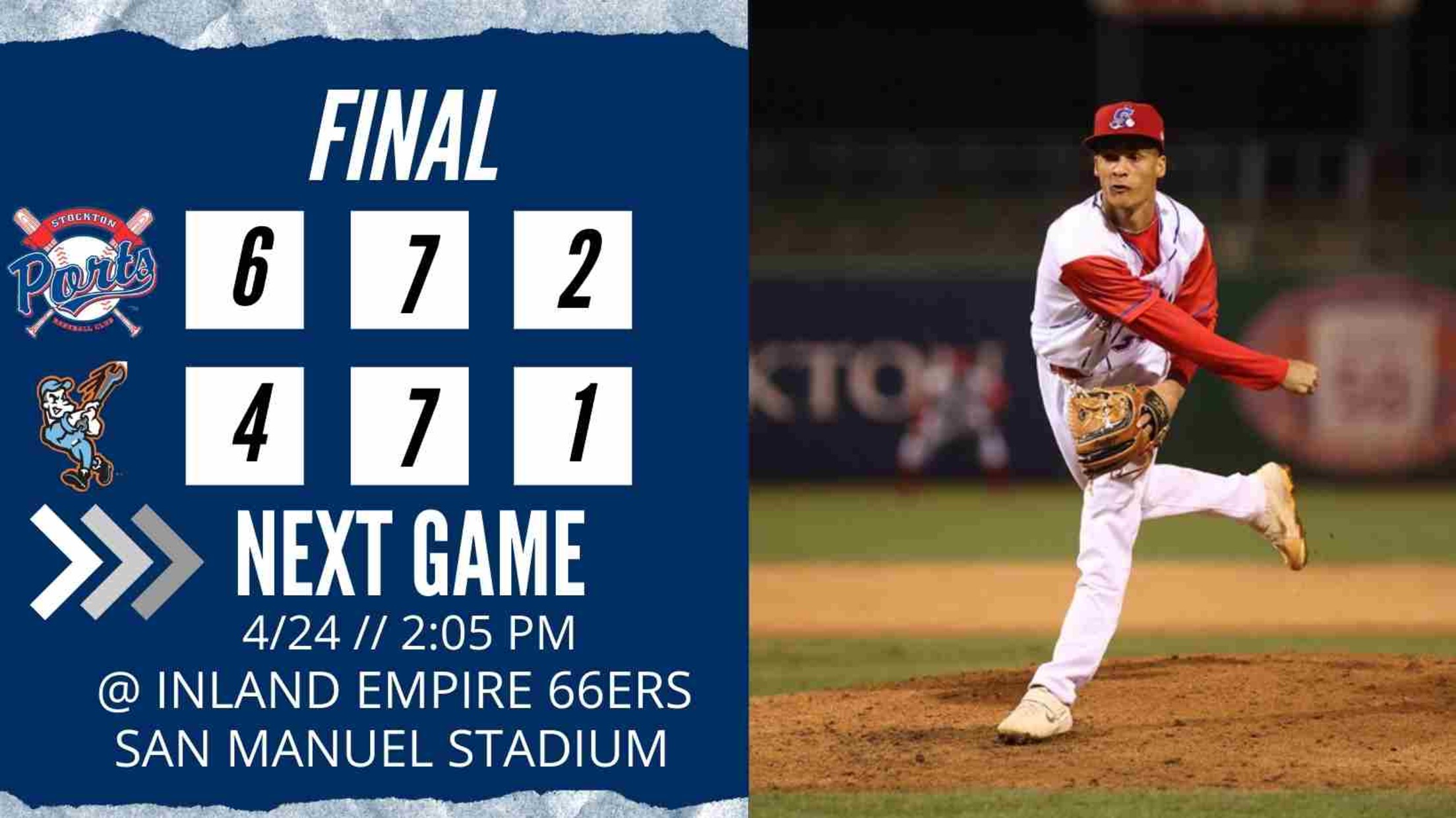 SAN BERNARDINO, Ca. – Junior Perez went 3-for-4 with two RBIs and two runs scored and Grant Judkins allowed just two unearned runs over 5.1 innings for his first career win as the Ports beat the Inland Empire 66ers 6-4 on Saturday night at San Manuel Stadium in San Bernardino.