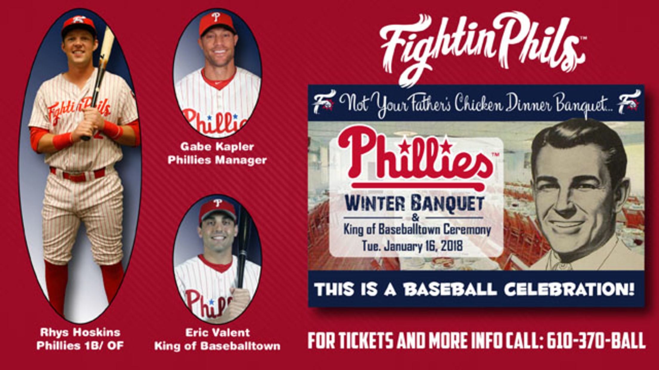 (Reading, PA) - Former Reading Fightin Phil and current Philadelphia Phillies first baseman Rhys Hoskins along with newly hired Phillies manager Gabe Kapler, Phillies starting pitcher Jerad Eickhoff and former Reading Fightin Phils and current Phillies pitcher Mark Leiter Jr. Jr. will headline the Phillies Caravan on Tuesday, January 16th