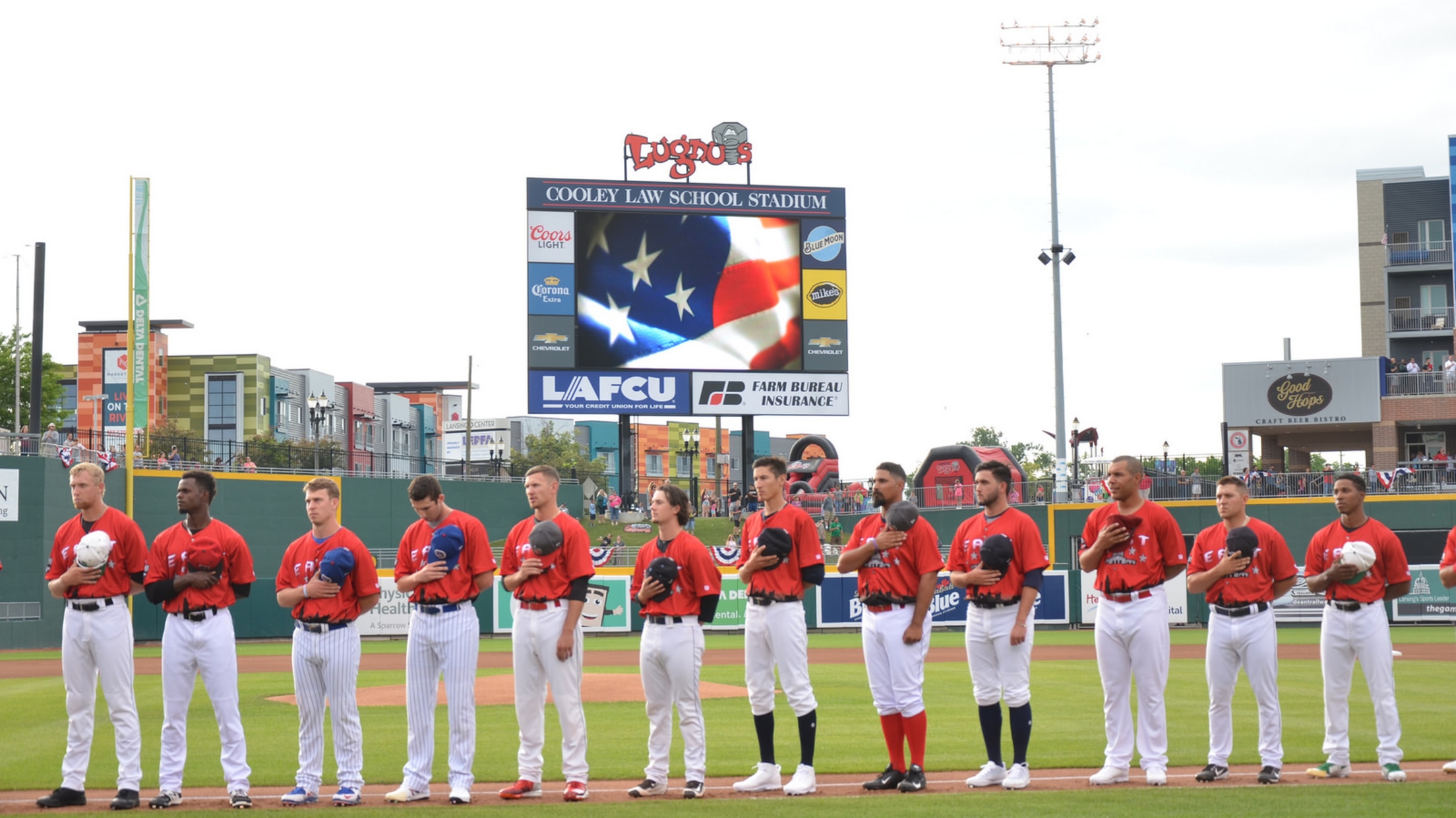 The Midwest League's East Division All-Star team poses for a group photo after a walk-off win in the 10th inning at Lansing. (Paul Gierhart/MiLB.com)