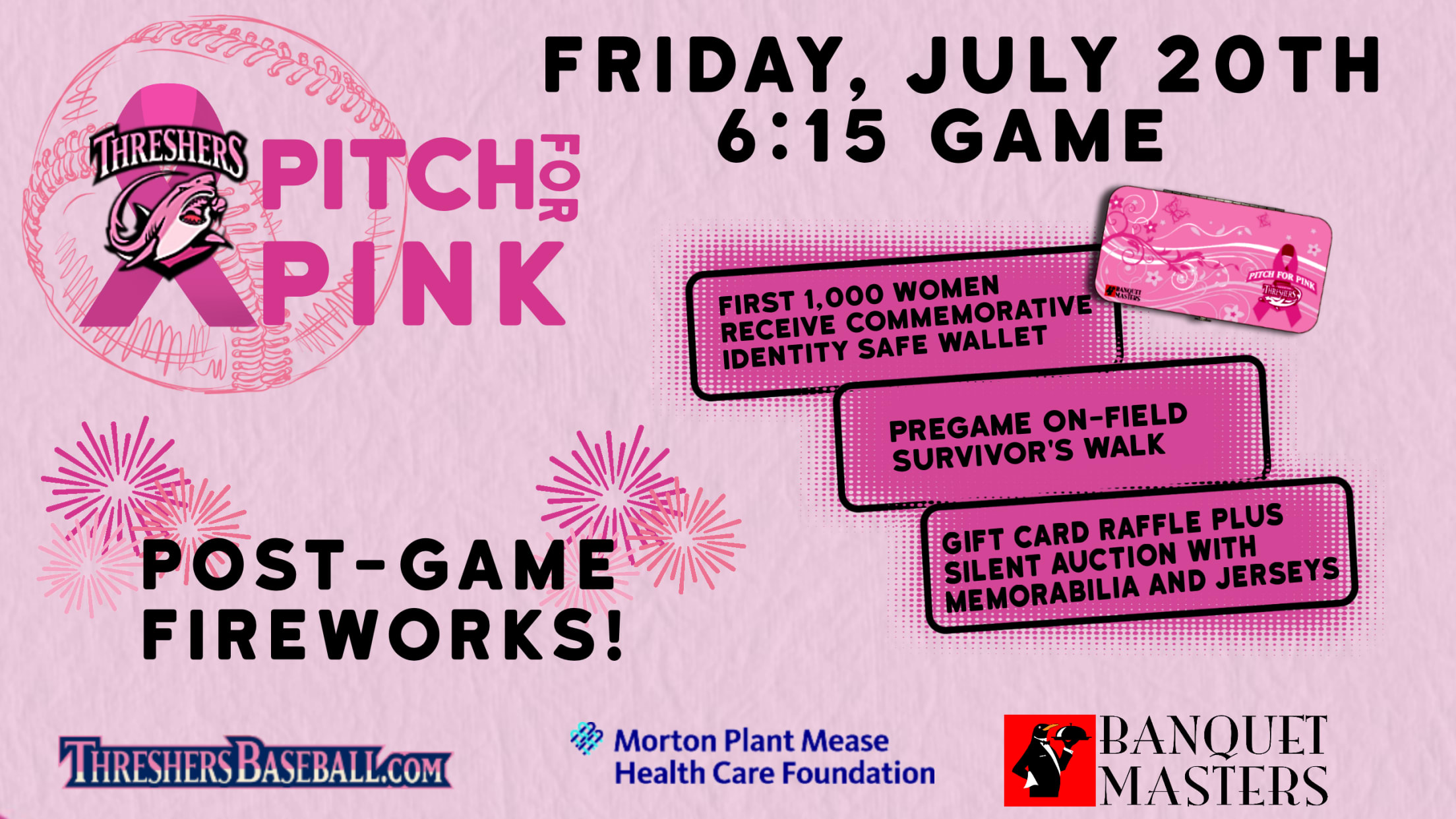 TICKETS ON THRESHERSBASEBALL.COMCLEARWATER, Fla. - Join the Clearwater Threshers for the 13th annual Pitch for Pink event on Friday, July 20, at Spectrum Field. The breast cancer awareness event and fundraiser has generated more than $273,000 for the Morton Plant Mease Foundation. Stay after the game for a spectacular fireworks show,