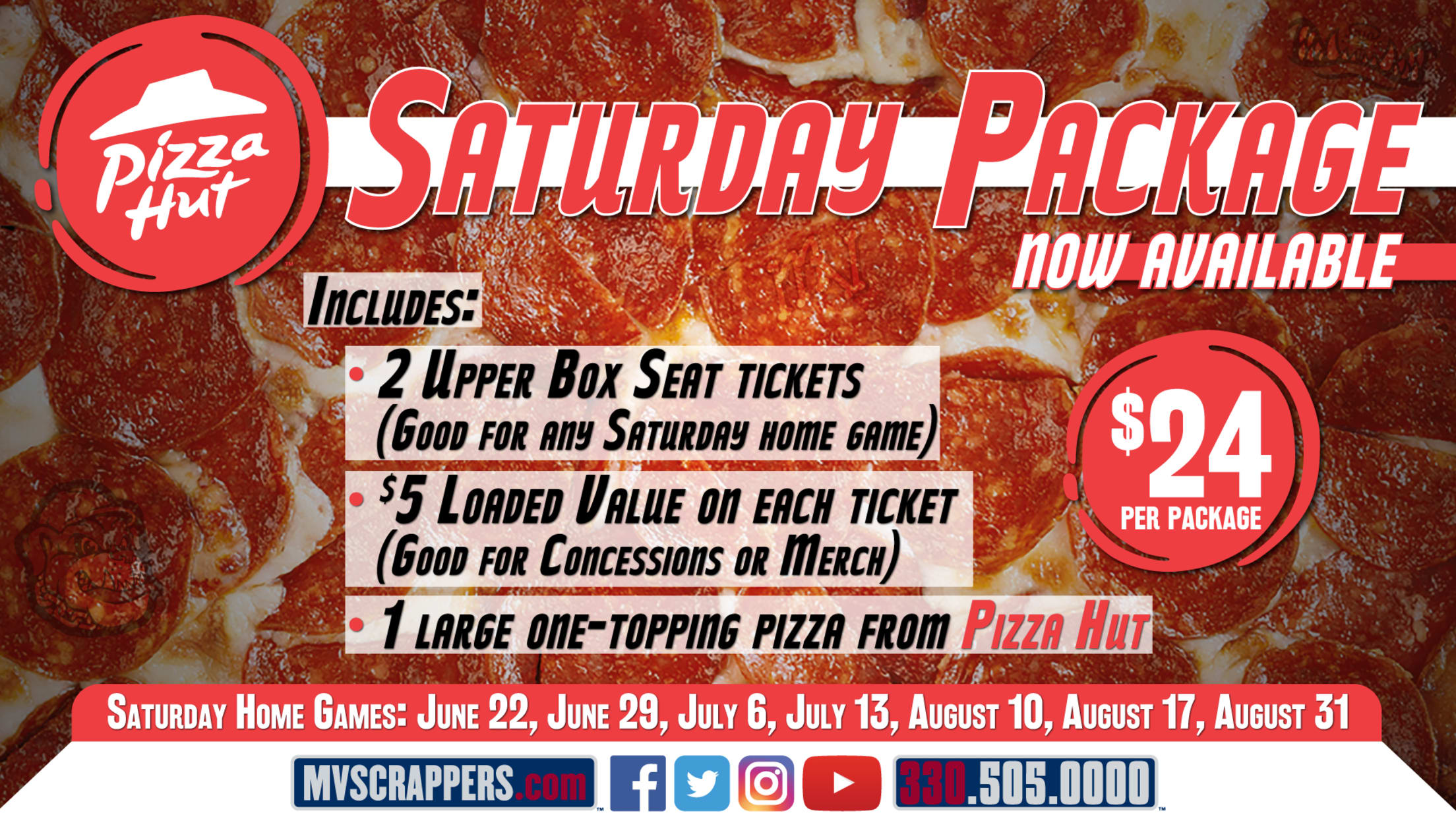 NILES, OH - The Mahoning Valley Scrappers are pleased to announce a Pizza Hut Saturday Package for the 2019 season. The package includes 2 Upper Box seat tickets to any Saturday home game, $5 loaded value on each ticket (valid for concessions or merchandise) and 1 large one-topping pizza from