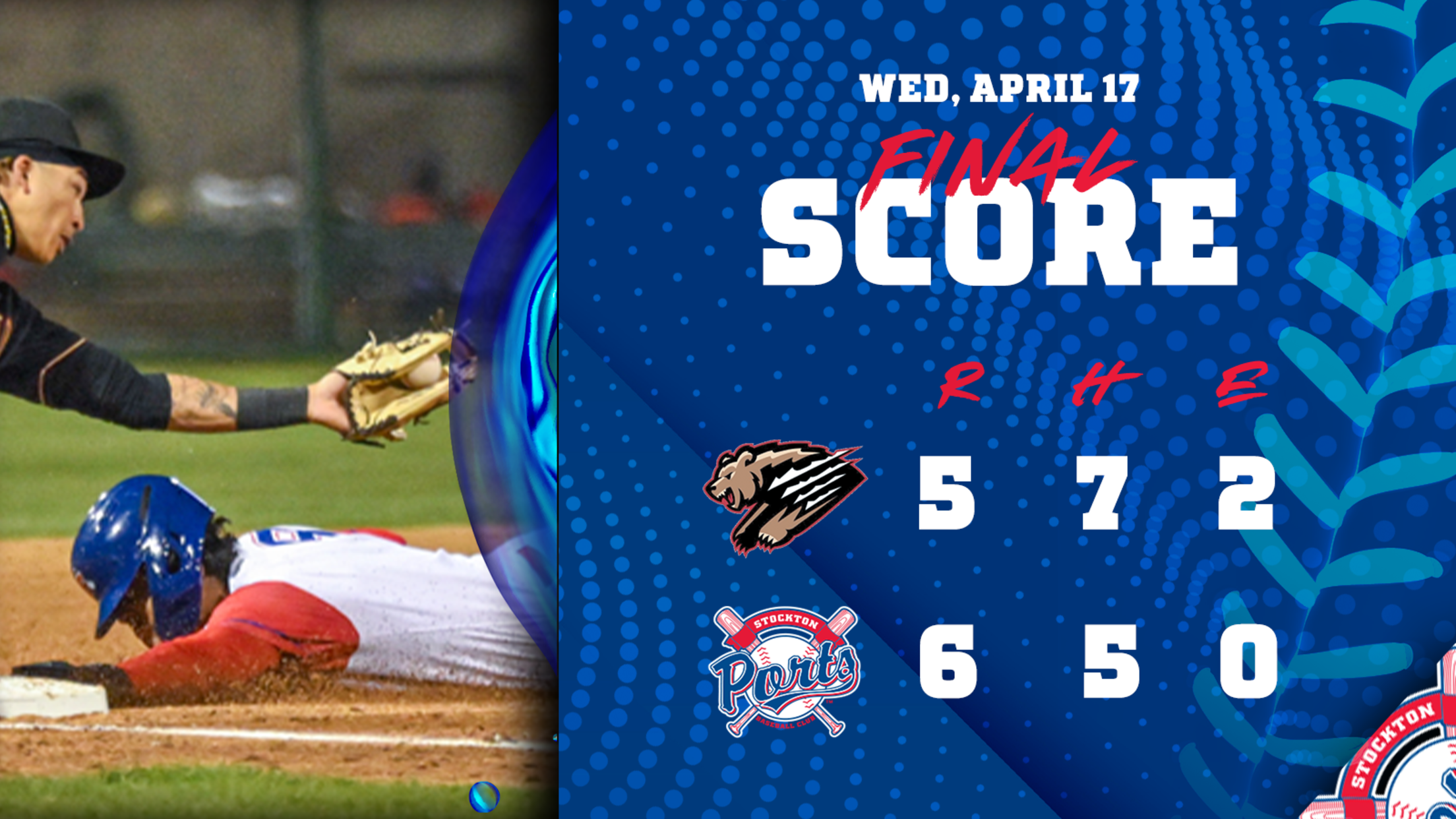 STOCKTON, Calif. — Ports third baseman Luke Mann hit a bounding ball between the diving attempts Fresno’s first and second baseman with the bases loaded in the bottom of the ninth inning Wednesday night, scoring two runs and give Stockton (3-6) their first walk-off win of the season in a 6-5 victory over the Grizzlies (6-3).