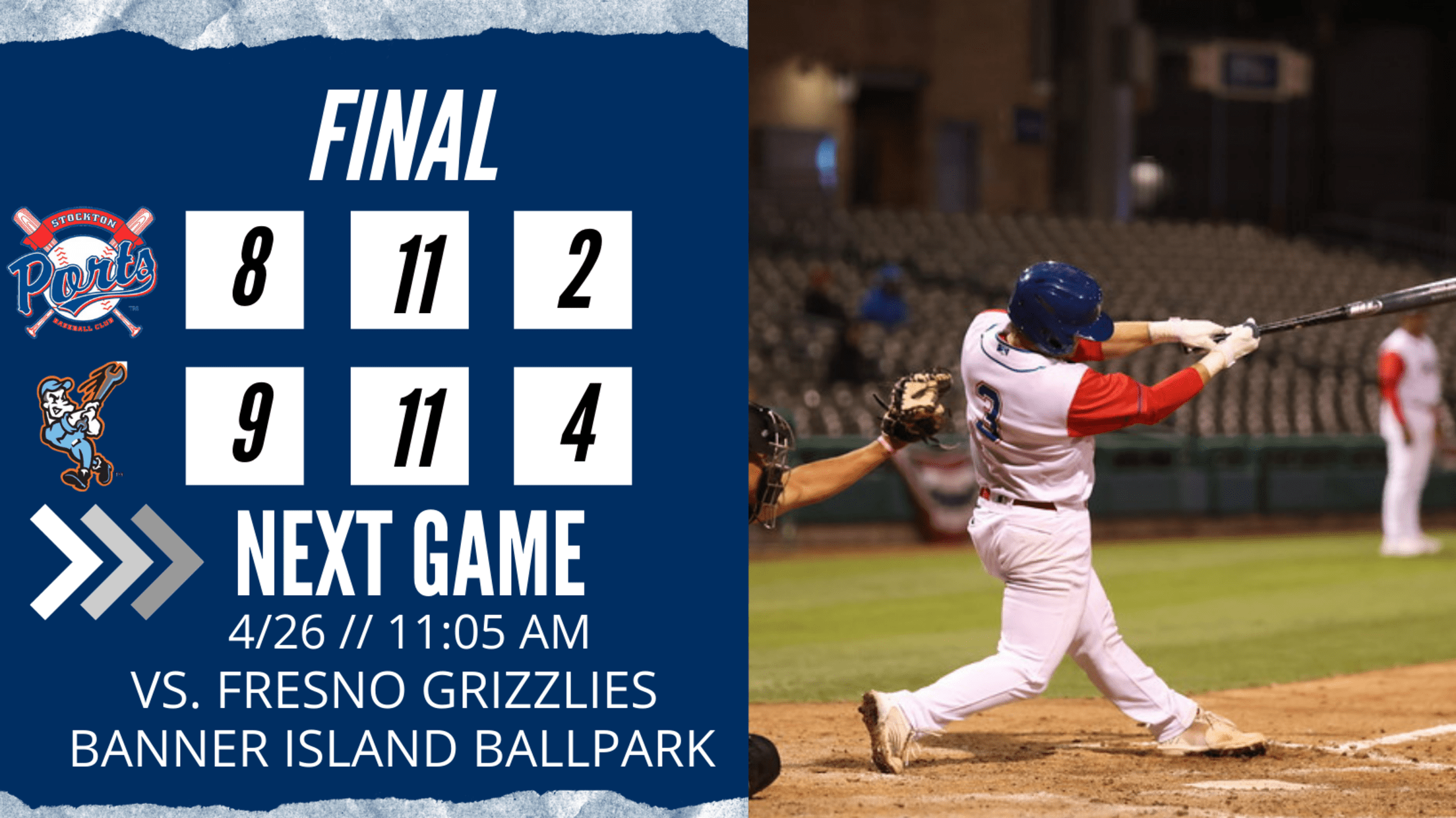 The Ports return home to Banner Island Ballpark to open a 12-game homestand with a six-game series against the Fresno Grizzlies starting on Tuesday morning at 11:05 am. Tickets are available at stocktonports.com.