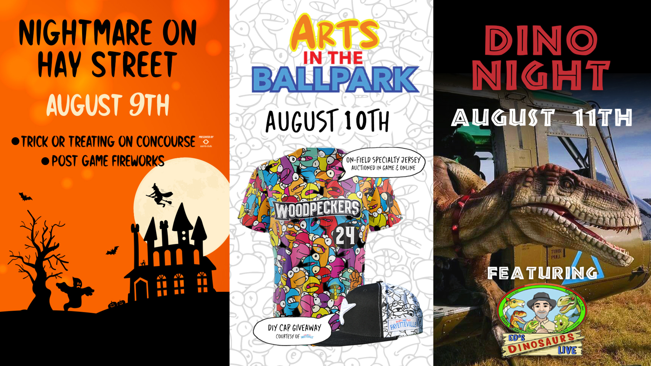 This weekend is still loaded with great promotions! Friday night is Nightmare on Hay Street. Dress up for the occasion! Kids can trick-or-treat around the concourse at a variety of stations, presented by Sam's Club! Following the conclusion of game two, we'll have another postgame fireworks show themed to Halloween music! Saturday is Arts in the Ballpark, presented by DistiNCtly Fayetteville! The team will be wearing special on-field jerseys designed by local artist Brandon Dean Johnson that have his colorful creatures 'The Hoodlins' on it. Jerseys will be auctioned off both in-game and online. ALSO, the first 1,000 fans through the gates will take home a 'color your own' cap and a package of markers! Finally, Sunday is Dino Day! Ed's Dinosaurs Live will be at the park with his crew of Dino's. They'll be wandering the park engaging with fans and one will even throw out the first pitch! Following the game, kids can run the bases and families can play catch in the outfield.
