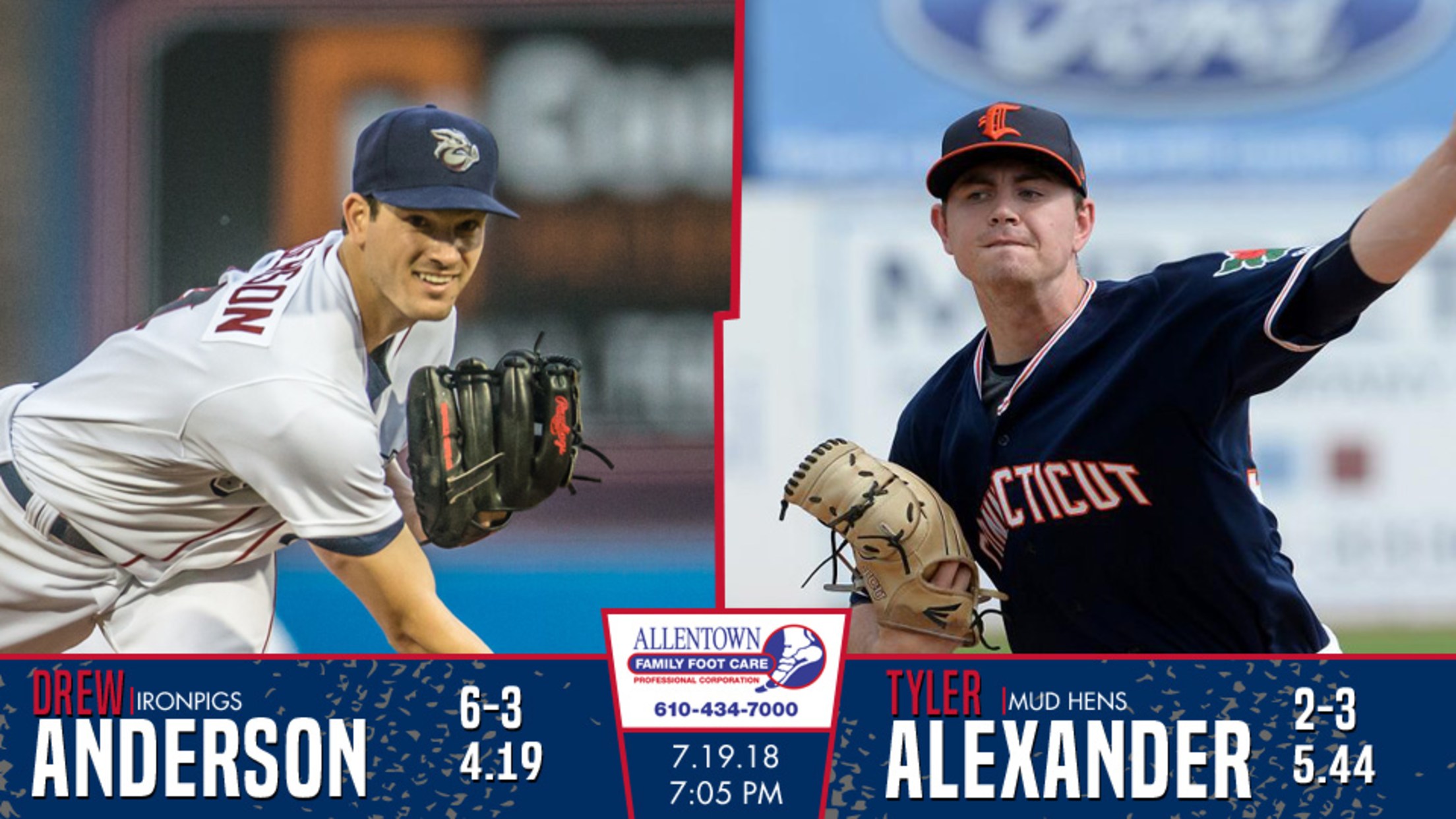 Drew Anderson gets the ball in game one against Toledo. Anderson did not pitch when the Pigs and Mud Hens met at Coca-Cola Park. On the season, he is 6-3 with a 4.19 ERA. Last time out against Buffalo he pitched six innings and allowed three hits. Alexander faced the Pigs in his Triple-A debut at Coca-Cola Park June 2. He went five innings and allowed six runs in a game that the Mud Hens won 8-7.