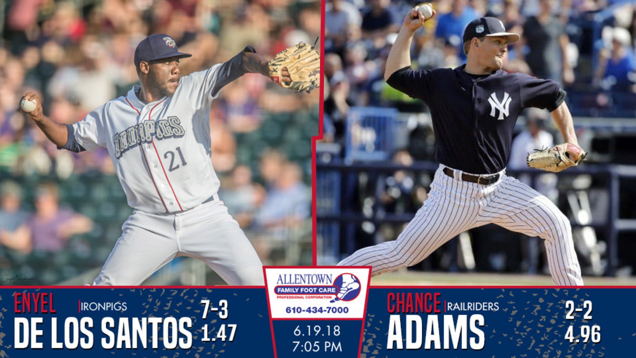De Los Santos leads the IL with a 1.47 ERA and is second in wins behind teammate Cole Irvin with seven. This season against the RailRiders, De Los Santos is 1-1 in three starts including two in Moosic. Adams tossed seven scoreless innings against the Pigs on May 16. He has made three starts this season against Lehigh Valley and is 1-1 with an ERA of 2.00.