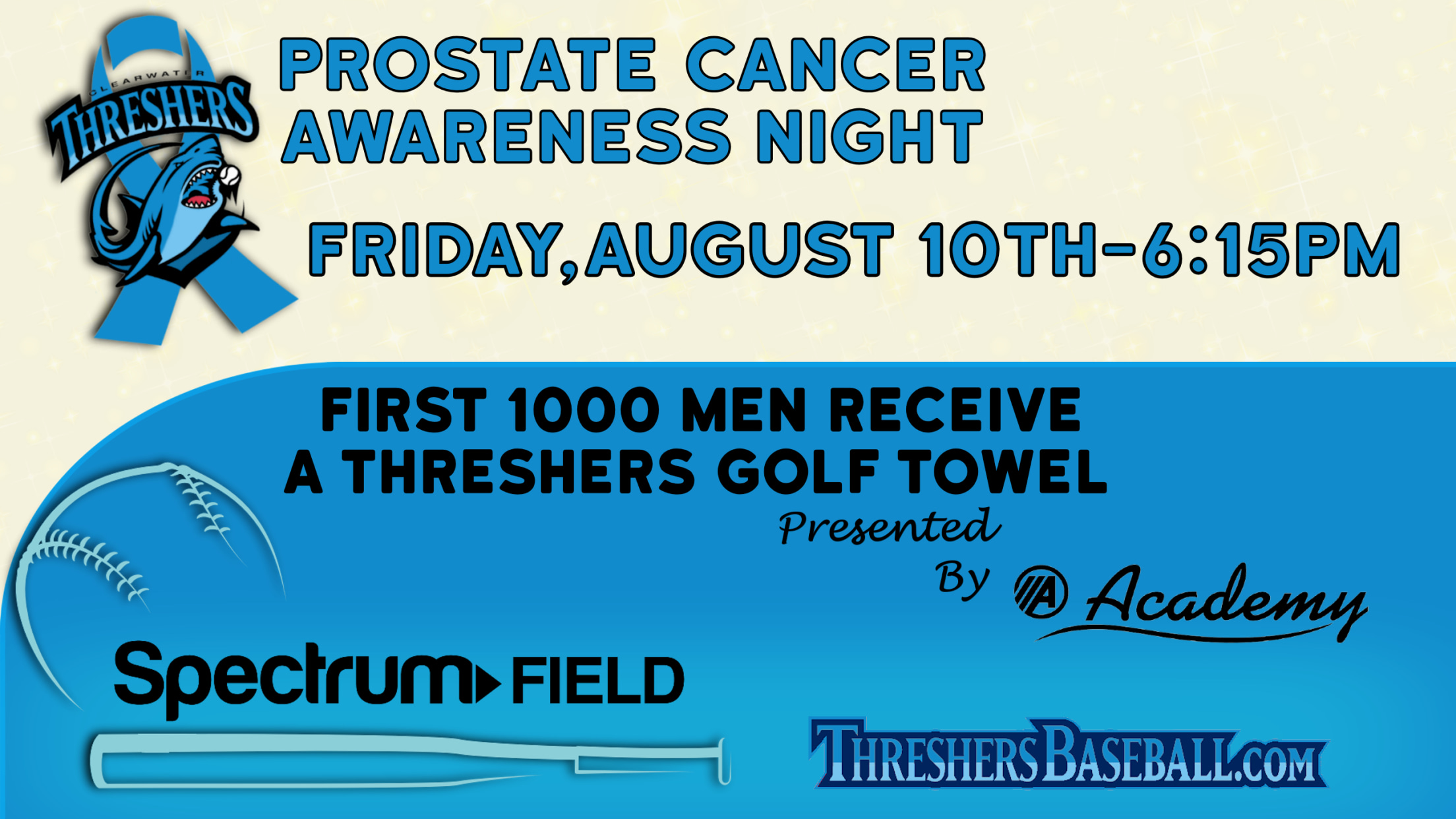 Prostate Cancer Awareness Night on Friday, August 10, serves as a fundraiser for the Morton Plant Mease Foundation and Ed Randall's Fans for the Cure. In addition to on-field ceremonies, in-game entertainment, and vendors on the concourse, there will be a silent auction. including Phillies memorabilia plus merchandise and gift cards from local businesses. Threshers players will be wearing a commemorative blue on-field cap for the game.