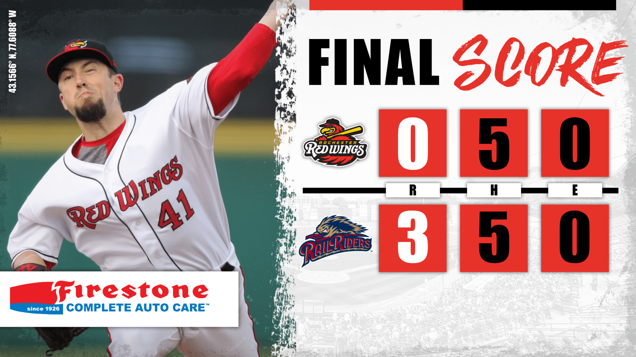 The Rochester Red Wings tied the Scranton Railriders in hits in Saturday evening’s game but were shutout, 3-0, as Scranton took a 3-2 series lead.