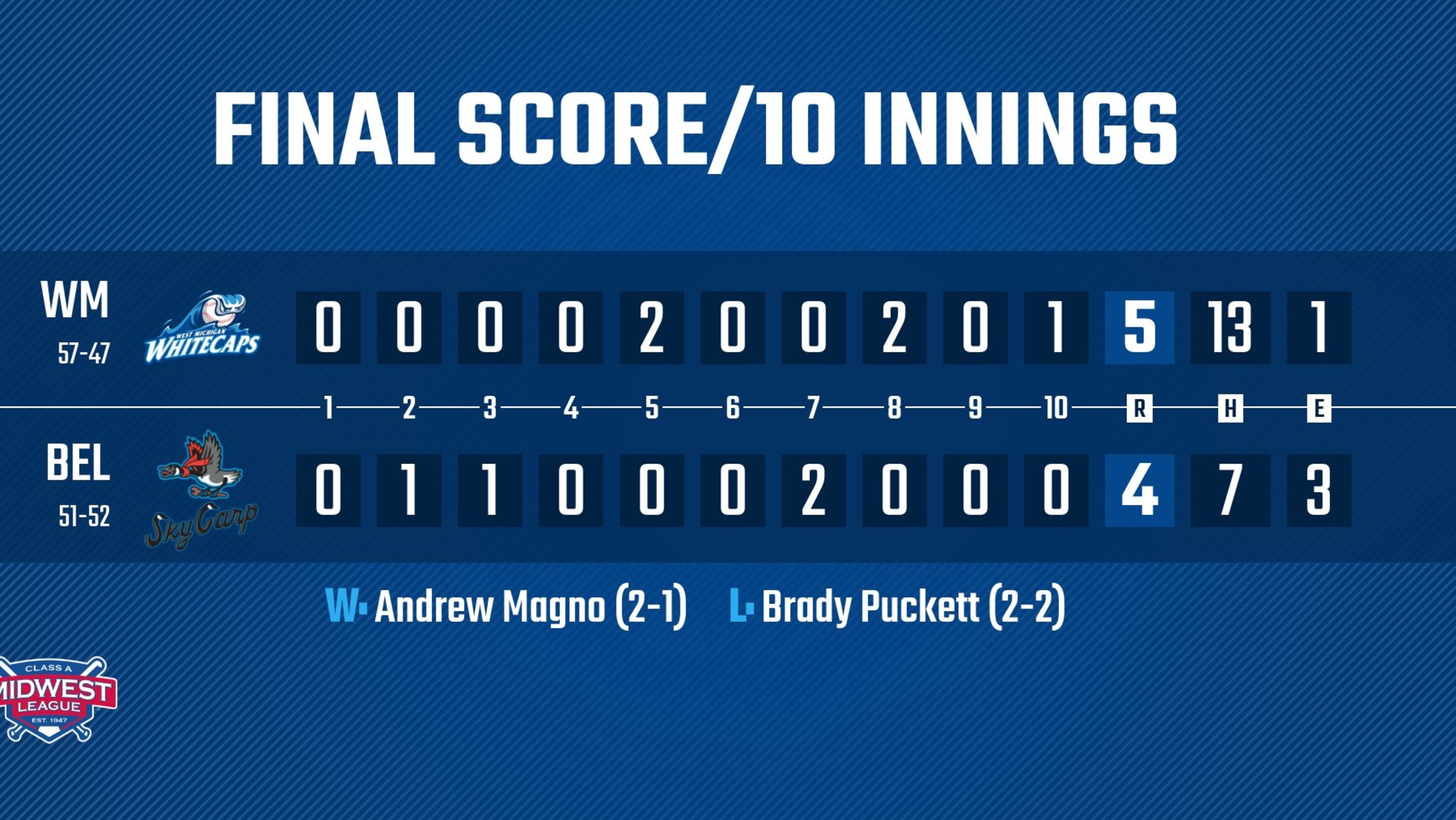 Magno (2-1) tossed two perfect innings in relief to collect his second win of the season, while Brady Puckett (2-2) took the tough-luck loss, his second of the season. The Whitecaps record jumps to 57-47 and 26-12 in the second half. The Sky Carp fall to 20-18 and 51-52 overall. Jace Jung enjoyed his first three-hit game in the professional ranks, going 3-for-5 at the plate. Meanwhile, Trei Cruz reached base four times, and Carlos Mendoza stroked a pair of singles to go along with a walk before being pulled from the game with a foot injury in the tenth inning.