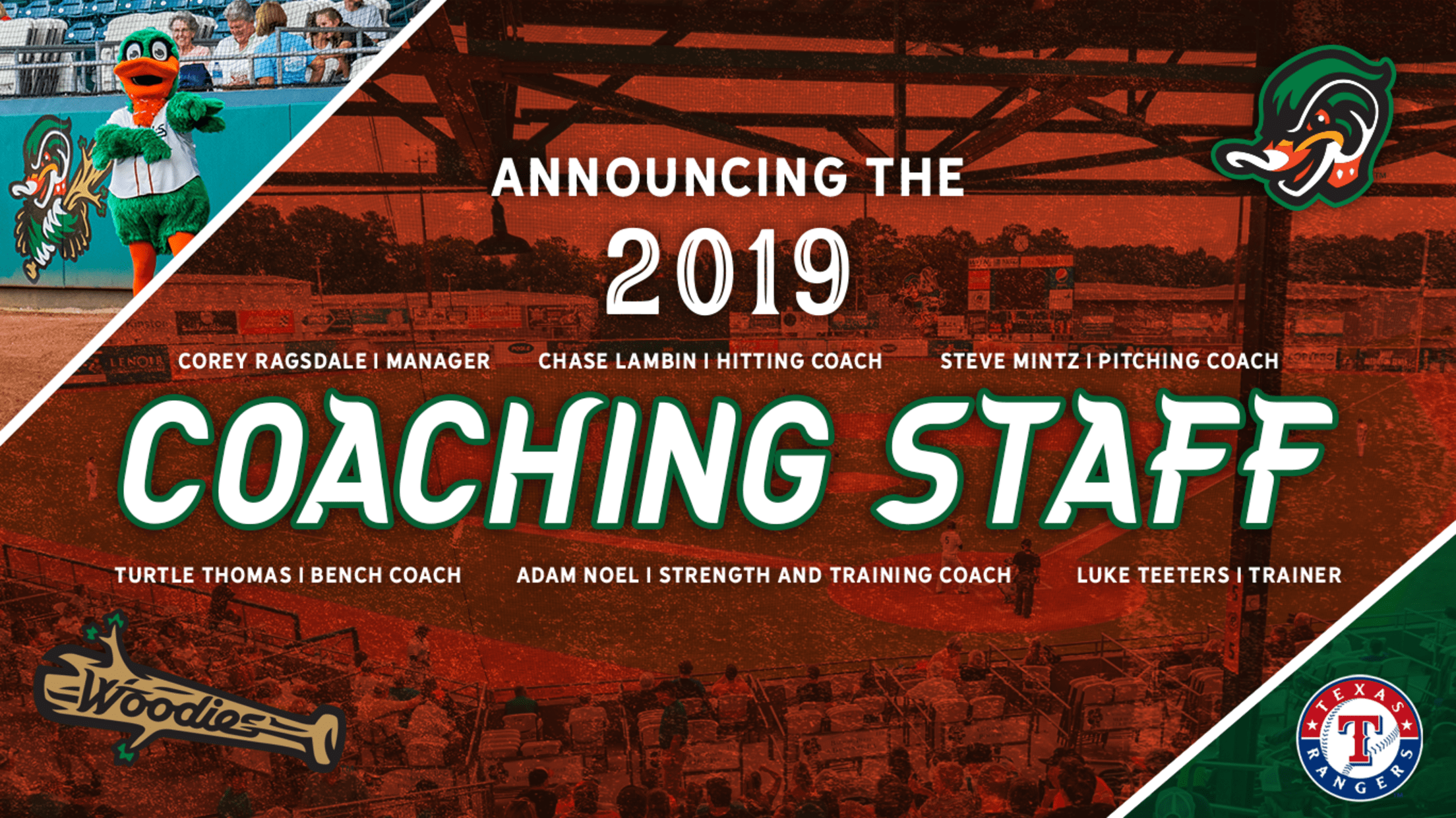 Ragsdale's staff at Down East will feature several new staff members as only Pitching Coach Steve Mintz returns to the club in 2019. Chase Lambin (Hitting) and Turtle Thomas (Coach) both move to the Wood Ducks after spending last season with Hickory. Luke Teeters (Athletic Trainer) and Adam Noel (Strength Coach) also join the Woodies staff from Hickory.