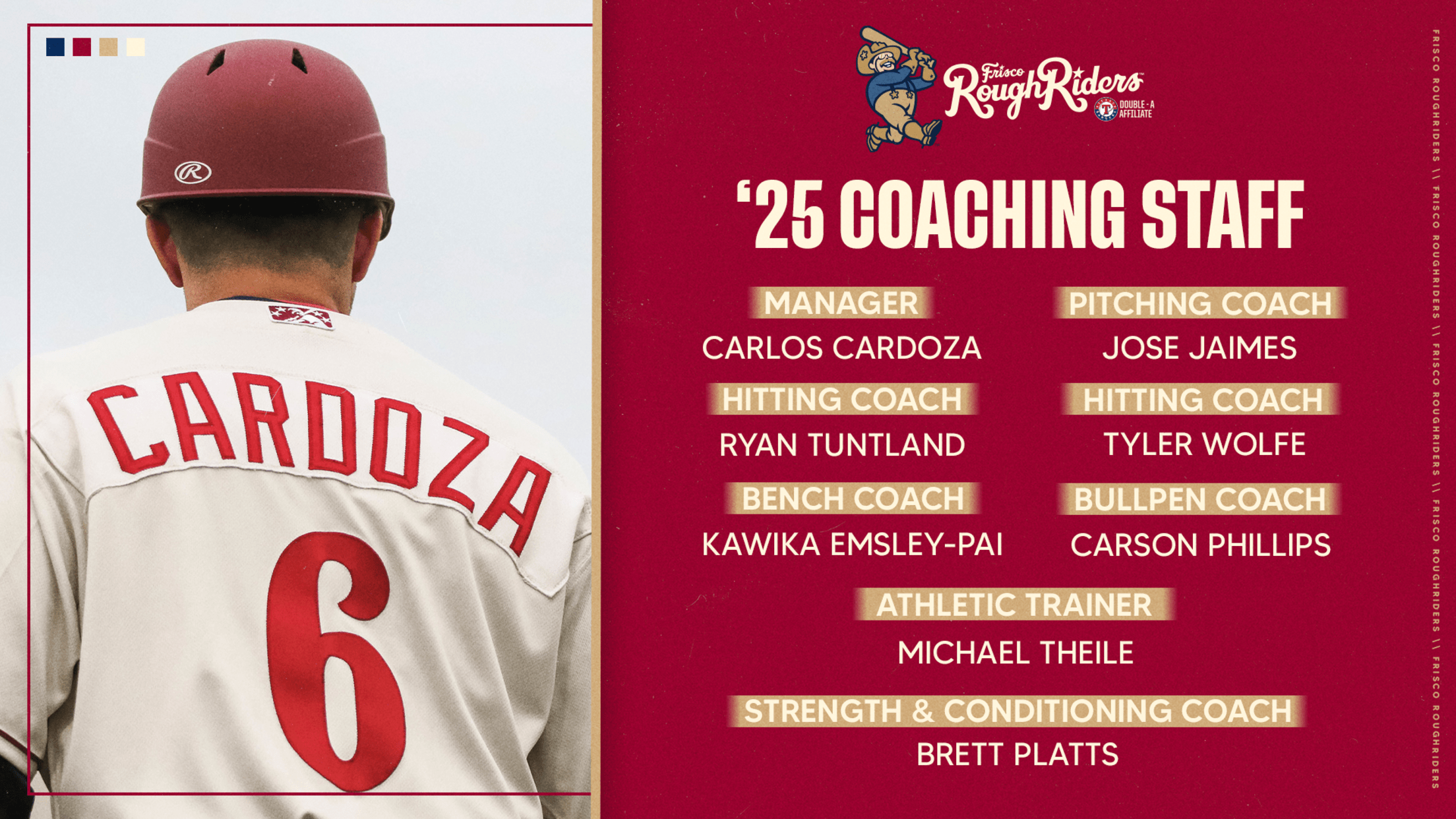 FRISCO, Texas (January 6, 2025) - The Frisco RoughRiders, in conjunction with the Texas Rangers, have announced Carlos Cardoza will return to manage the RoughRiders for the 2025 season. Cardoza, in his third year, will be joined by returners Ryan Tuntland (hitting coach), Tyler Wolfe (hitting coach), Kawika Emsley-Pai (bench coach) and Brett Platts (strength and conditioning coach). Jose Jaimes (pitching coach), Carson Phillips (bullpen coach) and Michael Theile (athletic trainer) round out the 2025 Riders staff as new members to Frisco.