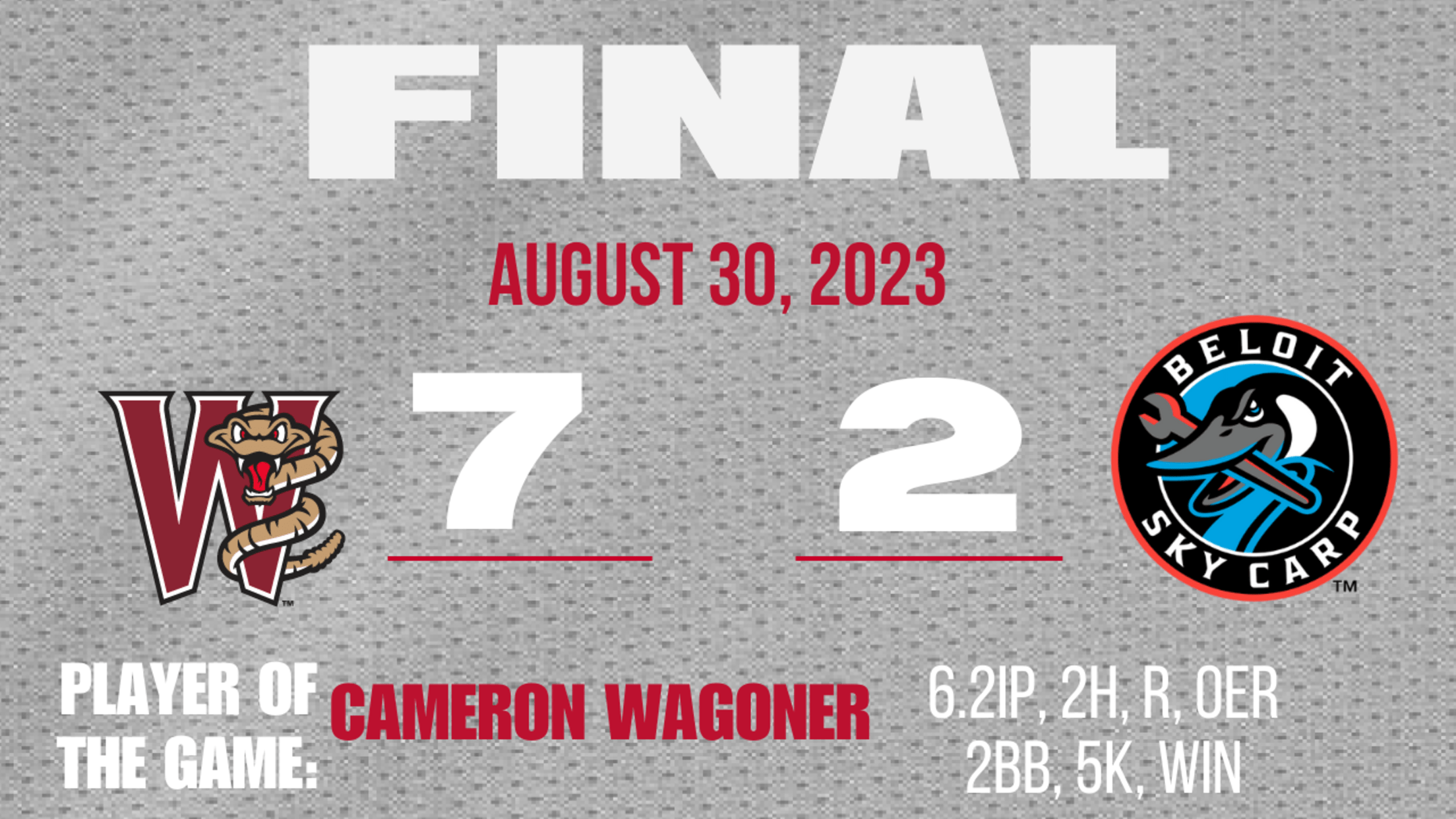BELOIT, WI – Wisconsin starting pitcher Cameron Wagoner was 1-11 with an ERA of 7.21 after a loss at home to the Beloit Sky Carp on July 8. Since that start in early July, Wagoner has gone 5-0 in seven games – six starts – and lowered his ERA to 5.83. In his latest outing, Wagoner allowed one unearned run on two hits with five strikeouts over 6-2/3 innings at ABC Supply Stadium to defeat the Sky Carp and lead the Rattlers to a 7-2 victory on Wednesday night.