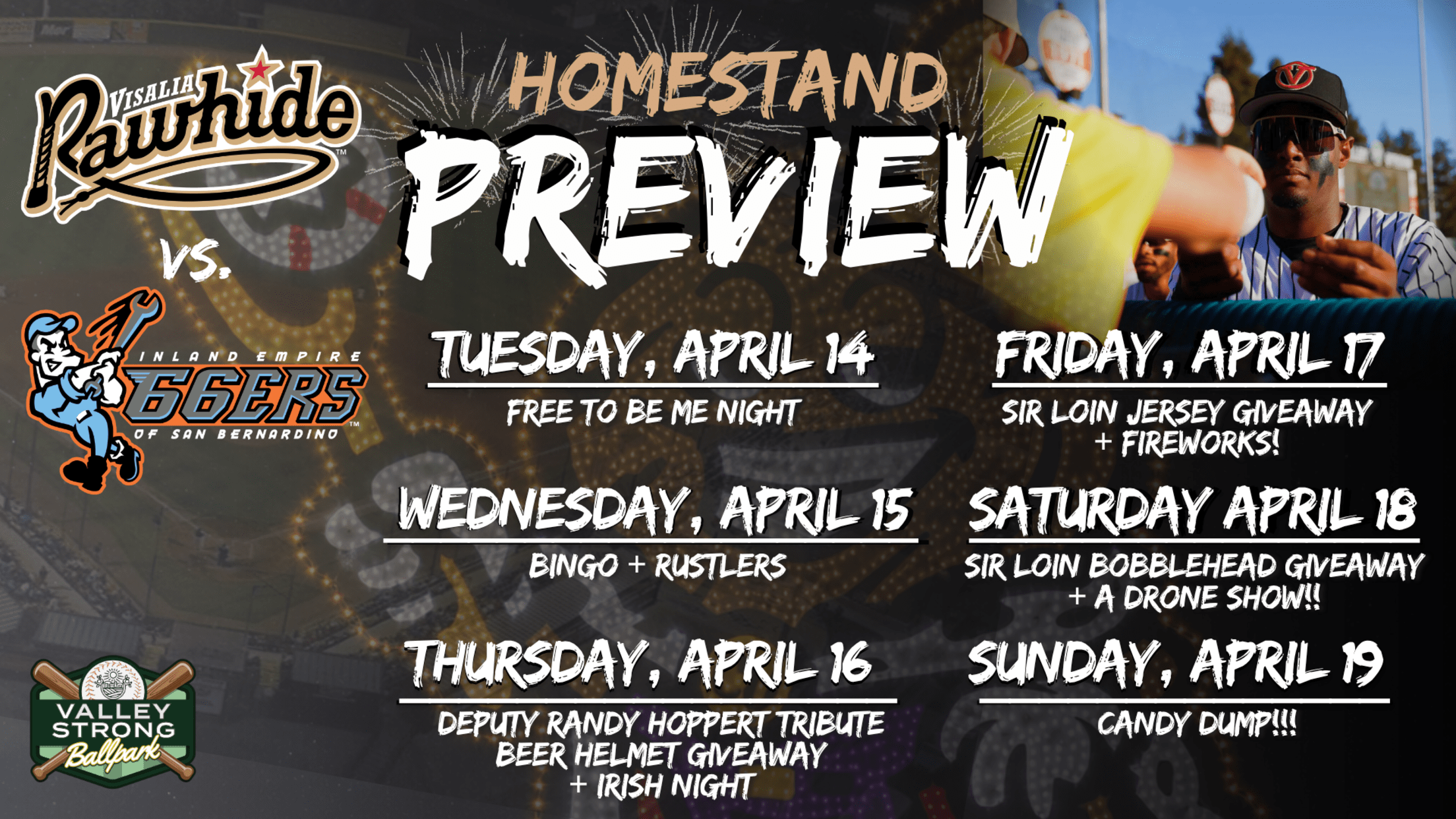 Visalia, CA – The Visalia Rawhide host their first six game homestand of the year against the Inland Empire 66ers starting Tuesday at Valley Strong Ballpark. The week will honor and bring together different Tulare County communities while fans of all ages can enjoy memorable giveaways and experiences.