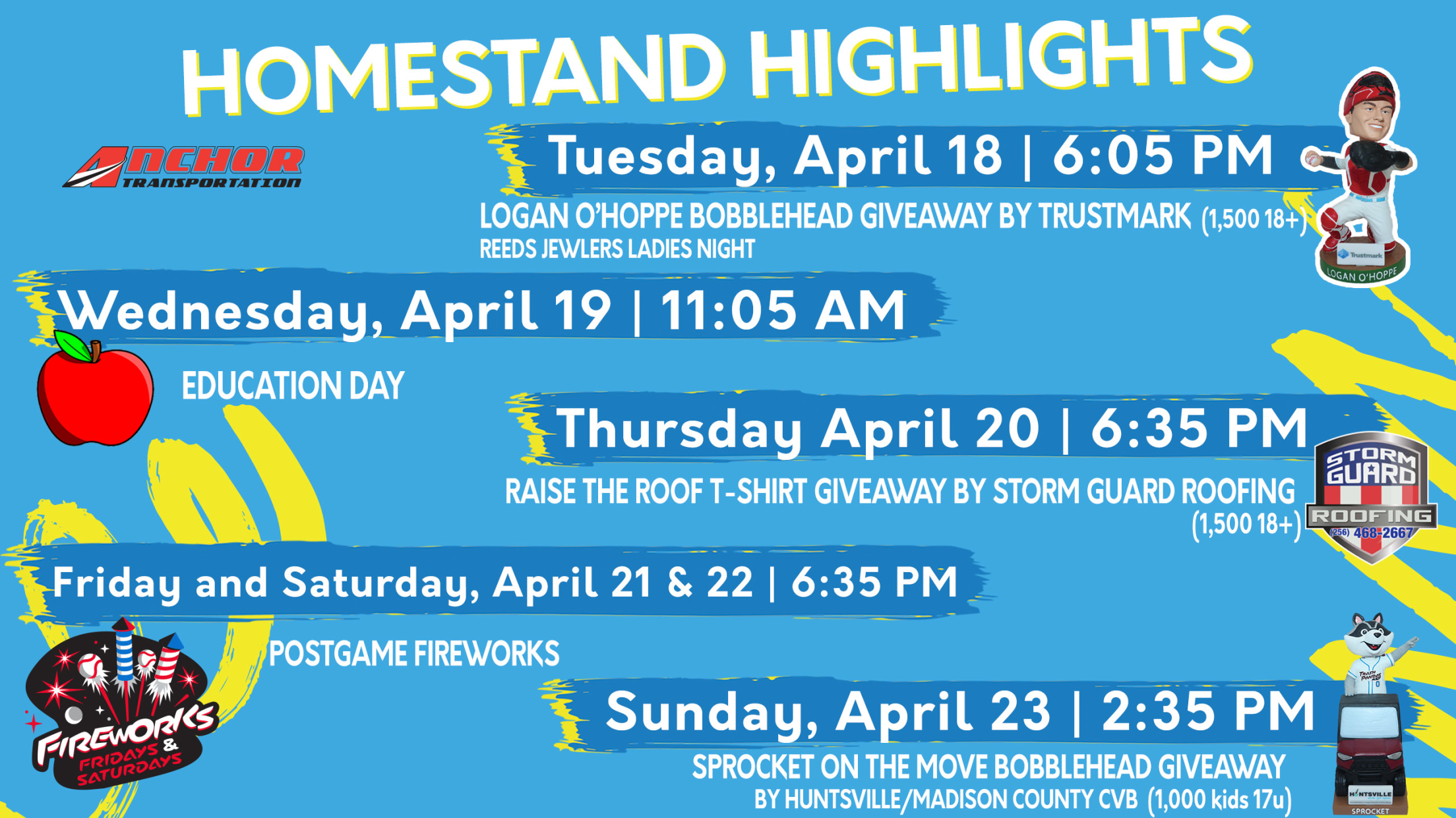 The Rocket City Trash Pandas return home for their first full six-game homestand of the 2023 season, with a loaded promotional schedule that features the first Education Day game of the season, two bobblehead giveaways, a t-shirt giveaway, and a pair of weekend fireworks spectaculars.
