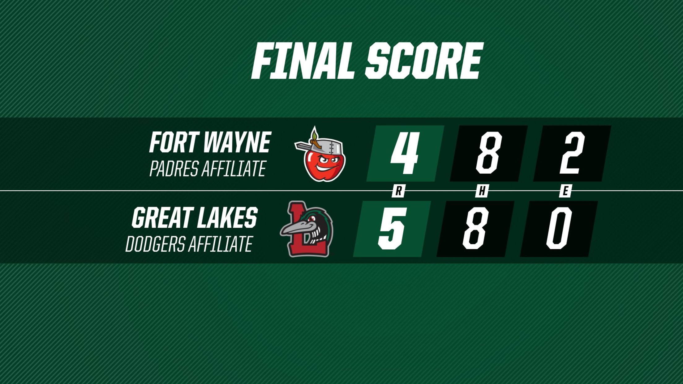 MIDLAND, Mich. – The TinCaps had a furious rally in the ninth inning, but lost Saturday afternoon at Dow Diamond against the Great Lakes Loons (Dodgers affiliate), 5-4.