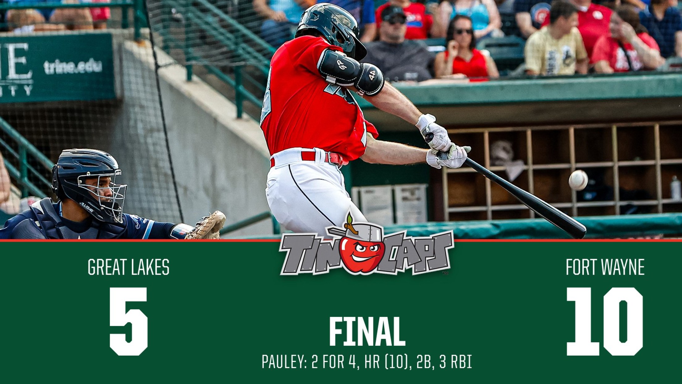 FORT WAYNE, Ind. _– _TinCaps left fielder Graham Pauley (No. 28 Padres prospect) blasted a home run for the second straight game and drove in three, starting pitcher Robby Snelling (No. 4 Padres prospect) struck out seven across five strong innings, and Fort Wayne’s offense exploded for to beat the Great Lakes Loons (Los Angeles Dodgers affiliate), 10-5, in front of a sellout crowd of 7,028 on Princess Night Tuesday at Parkview Field.