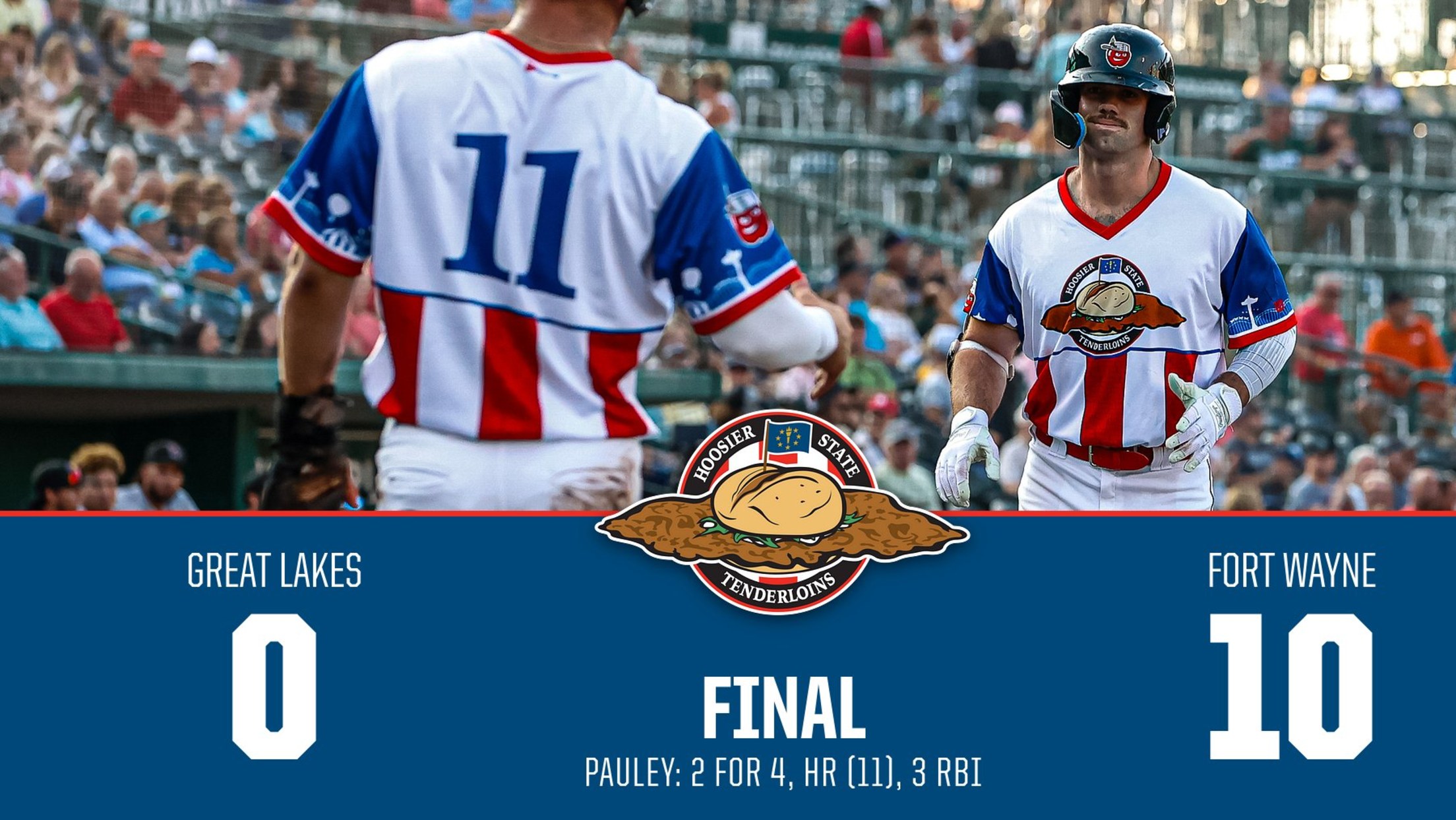 FORT WAYNE, Ind. _– _Playing as the Hoosier State Tenderloins, the TinCaps beat the Great Lakes Loons (Los Angeles Dodgers affiliate), 10-0, in front of a sellout crowd of 7,242 on Thursday night at Parkview Field. Third baseman Graham Pauley (No. 29 Padres prospect) and shortstop Kervín Pichardo both hit two-run homers, while Edwuin Bencomo, Ethan Routzahn, and *Will Geerdes *combined for the shutout. The victory, combined with a Dayton loss, has Fort Wayne tied for first place in the Midwest League East Division with 33 regular season games remaining.