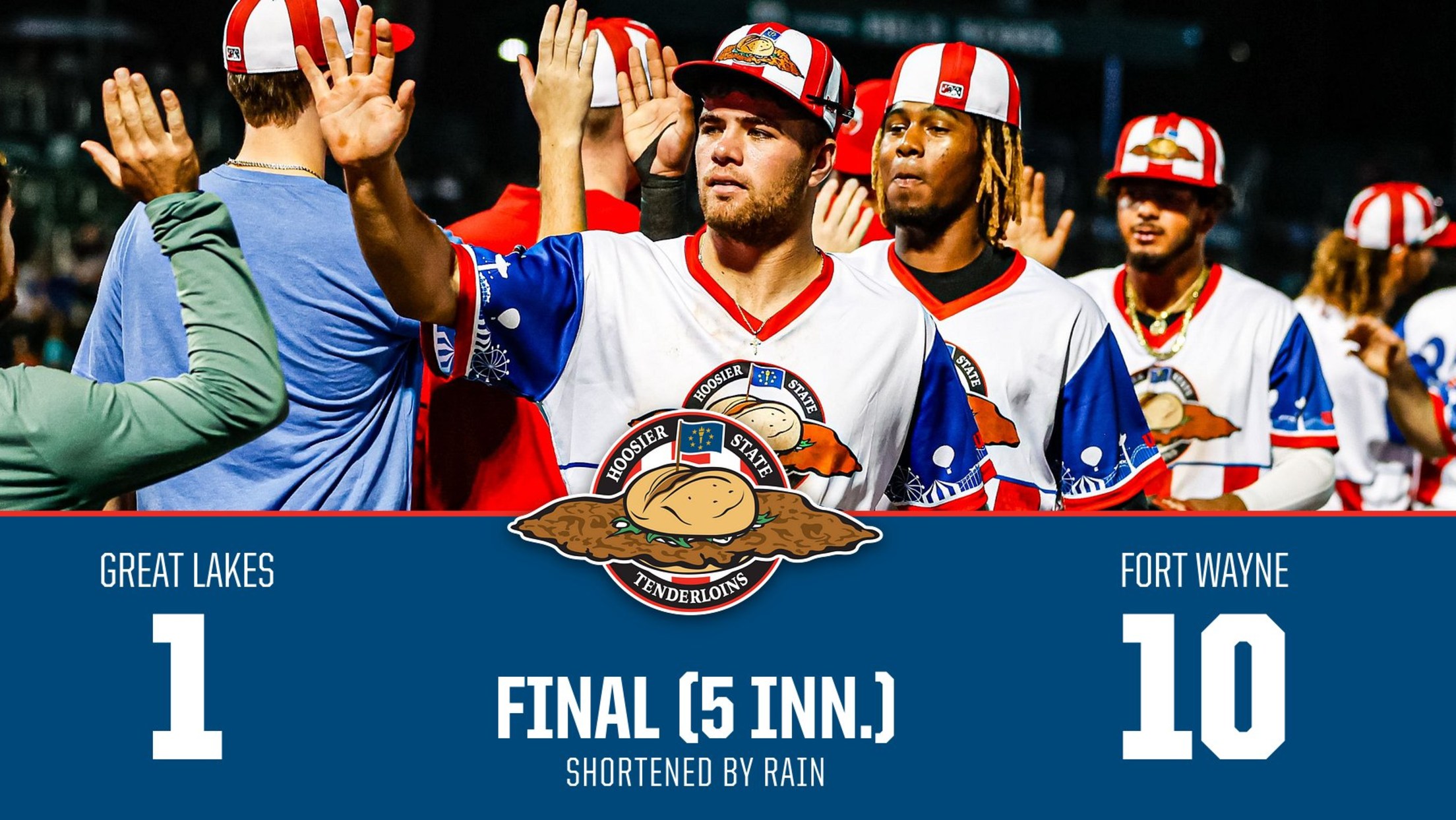 Box Score FORT WAYNE, Ind. – Playing as the Hoosier State Tenderloins, the first seven TinCaps hitters of the game reached base and scored Saturday night, paving the way to an eight-run first inning, and Fort Wayne throttled the Great Lakes Loons (Los Angeles Dodgers affiliate), 10-1. Rain delayed and