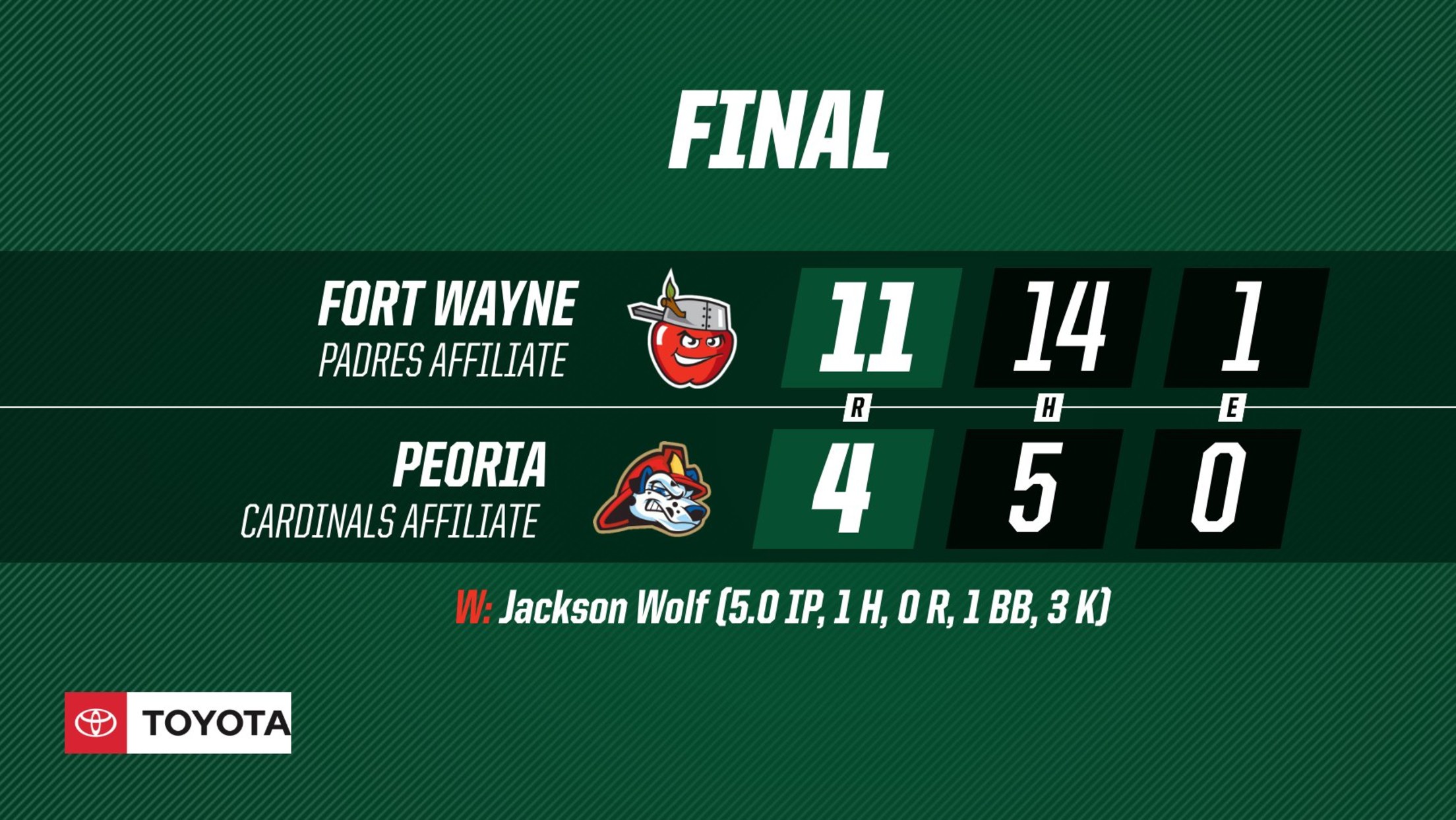 PEORIA, Ill. -- The Fort Wayne TinCaps won their third consecutive game on the road Tuesday night, drubbing the Peoria Chiefs (St. Louis Cardinals affiliate), 11-4, at Dozer Park.