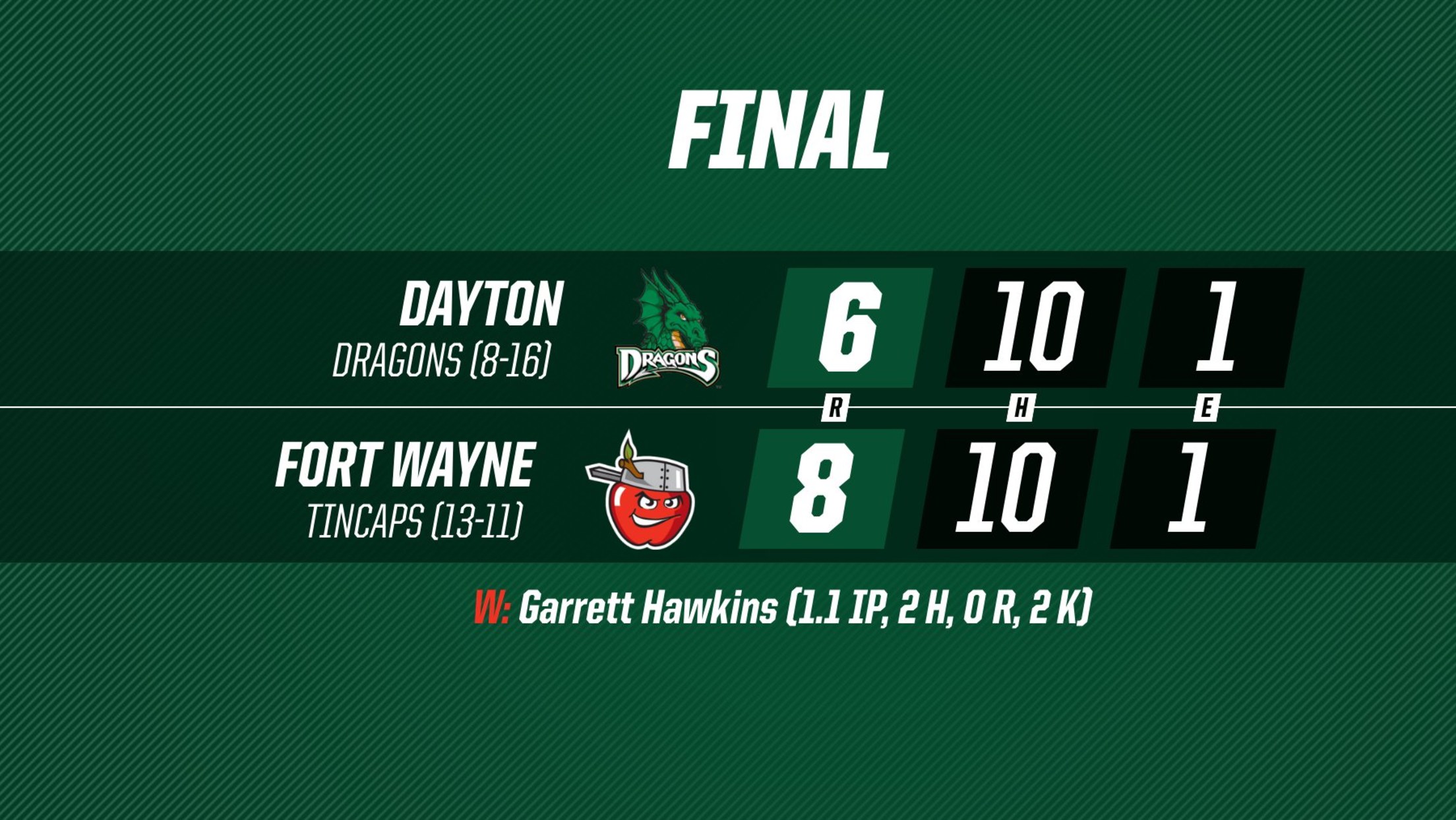 The Dragons got a run back in the fourth and plated three in the fifth. But the TinCaps answered in their half of the fifth as Jack Costello crushed a three-run homer to left-center field. Fort Wayne led 5-4 into the eighth before Dayton plated a pair to go in front, 6-5.