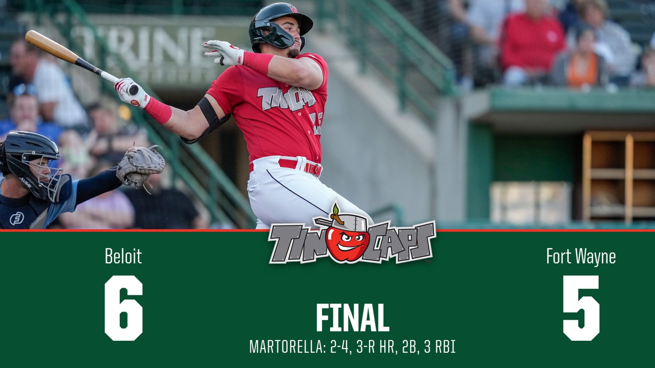 FORT WAYNE, Ind. – TinCaps left fielder Nathan Martorella blasted a three-run homer and catcher Juan Zabala hit his first bomb of the year, but the Beloit Sky Carp (Miami Marlins affiliate) rallied back from a two-run deficit to win 6-5 in a back-and-forth affair Wednesday night at Parkview Field.