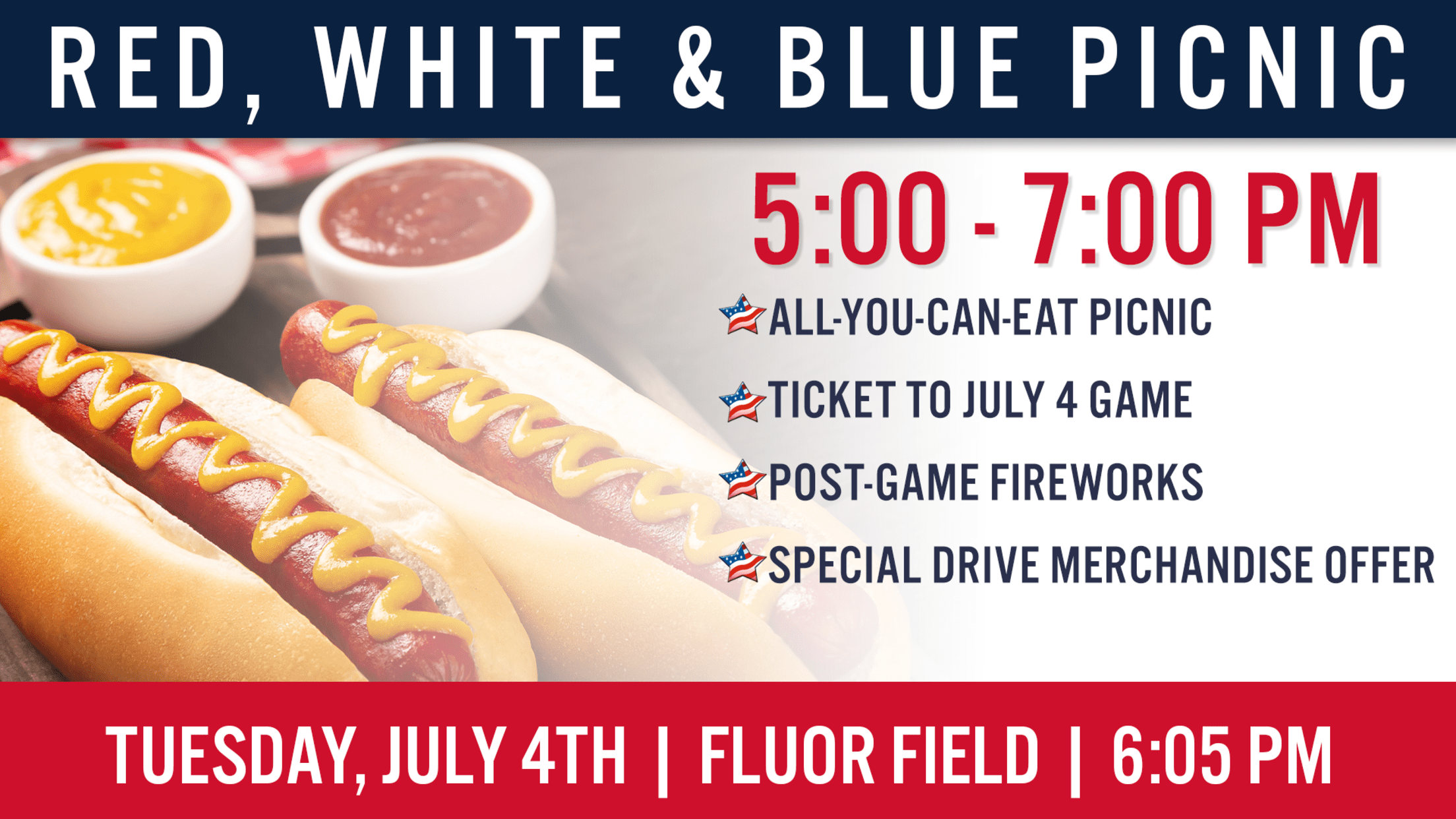 Independence Day is Celebrated Best with the Drive! Join us on Tuesday, July 4th for an all-American day of food, fun, and fireworks! Each ticket gains you access to an all-you-can-eat picnic buffet complete with our ballpark favorites - hot dogs & burgers, mac & cheese, coleslaw, baked beans and