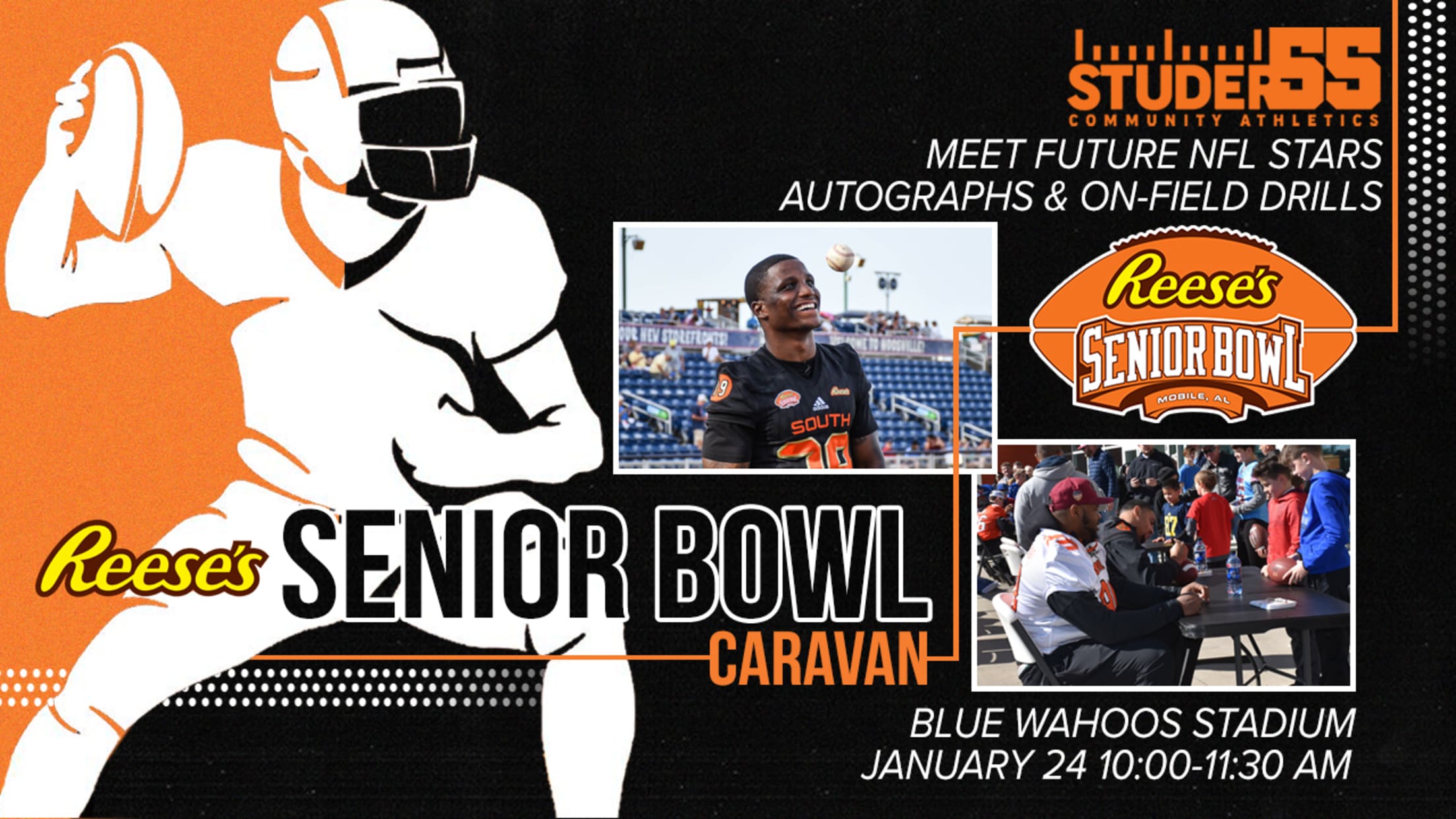 The 2020 Reese's Senior Bowl Caravan will visit Pensacola on Friday, January 24 from 10:00 AM - 11:30 AM, bringing top NFL draft prospects from across the nation to Blue Wahoos Stadium for a morning of free on-field instruction for area youth football players (ages 6-14) and an autograph session. The players will join with Studer/55 Community Athletics to lead drills for children in attendance on-field from 10:00 AM until 10:45 AM and sign autographs from 10:45 AM until 11:30 AM. Admission to the event is free to the public and gates and stadium concessions will open at 9:30 AM.