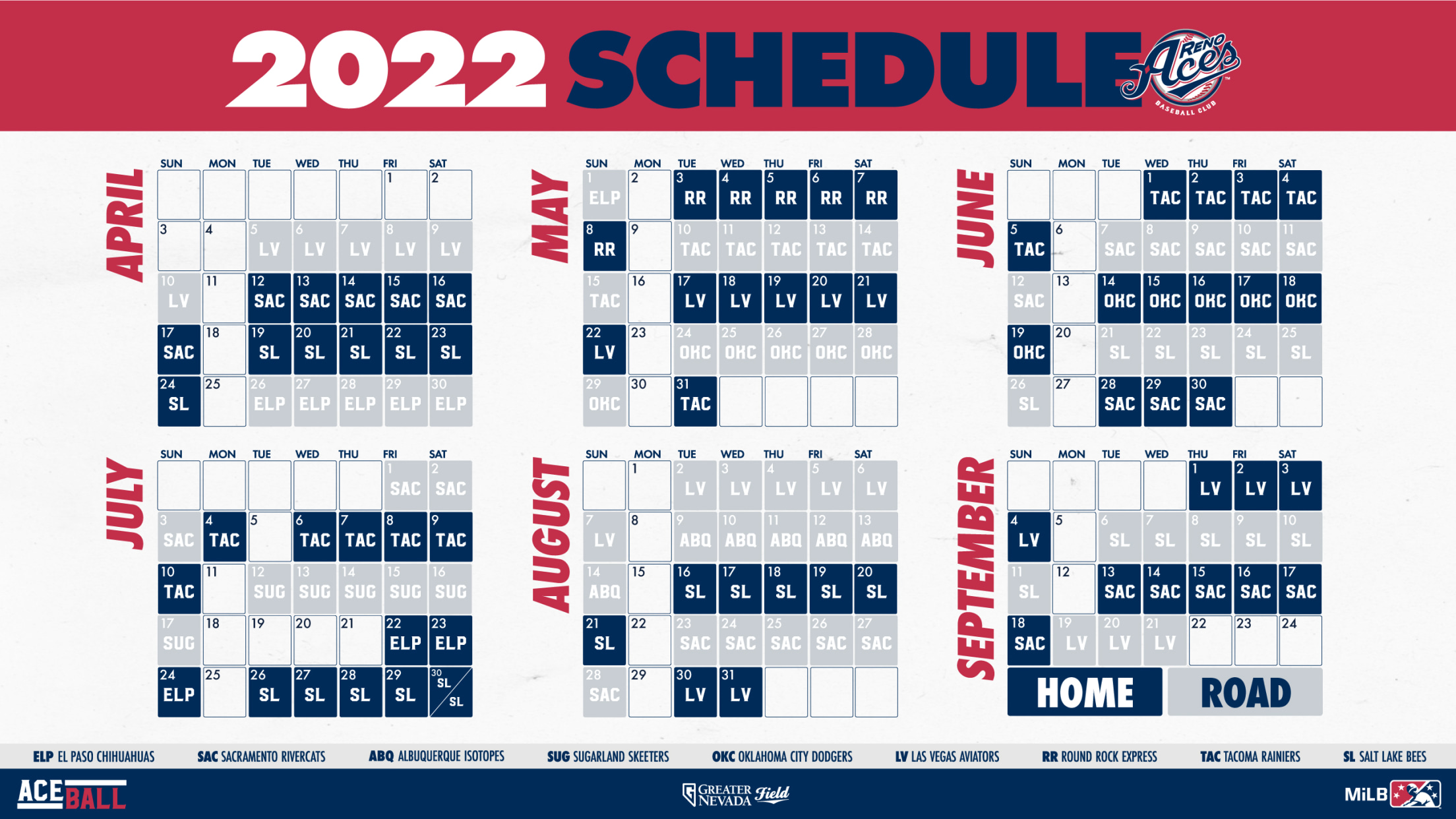 The Aces open on the road at Las Vegas Aviators on April 5, returning for the team’s home opener on April 12 against the Sacramento River Cats. Reno’s at home on the Fourth of July, hosting Tacoma after playing on the road for Independence Day in 2021.