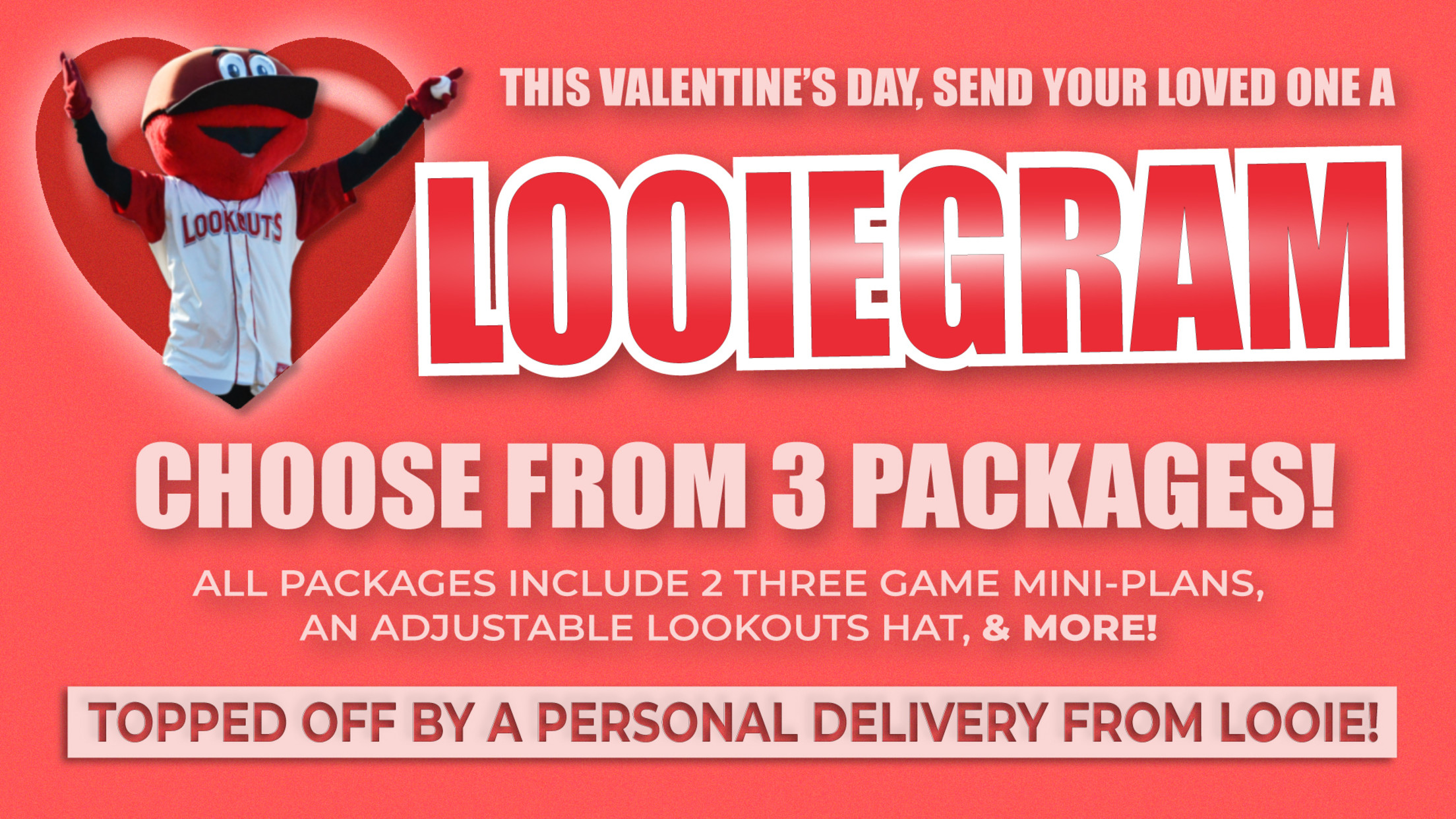 Looking for something extra special for your Valentine? Send them a Looiegram, delivered personally by Looie the Lookout! The Lookouts lovable mascot Looie, complete with your special message, will deliver packages to any residence or workplace within a 10-mile radius of AT&T Field. Packages will be delivered between 10am and 4pm on Tuesday, February 13 and Wednesday, February 14. We are offering 3 tailored package options for that special person in your life. Each package includes TWO 3-game Lower Box Mini-Plans (dates pre-selected), a Lookouts hat, a card and more. To reserve a Looiegram, please fill out the Looiegram order form found HERE and return it by email to [email protected]. The deadline to order is Tuesday, February 6 or until supplies last. Please call 423.267.4849 with any questions. You will receive an email or phone call to confirm your delivery. Our store hours are Monday - Friday 9am - 5pm. A limited number of Looiegram deliveries are available, reserve early.