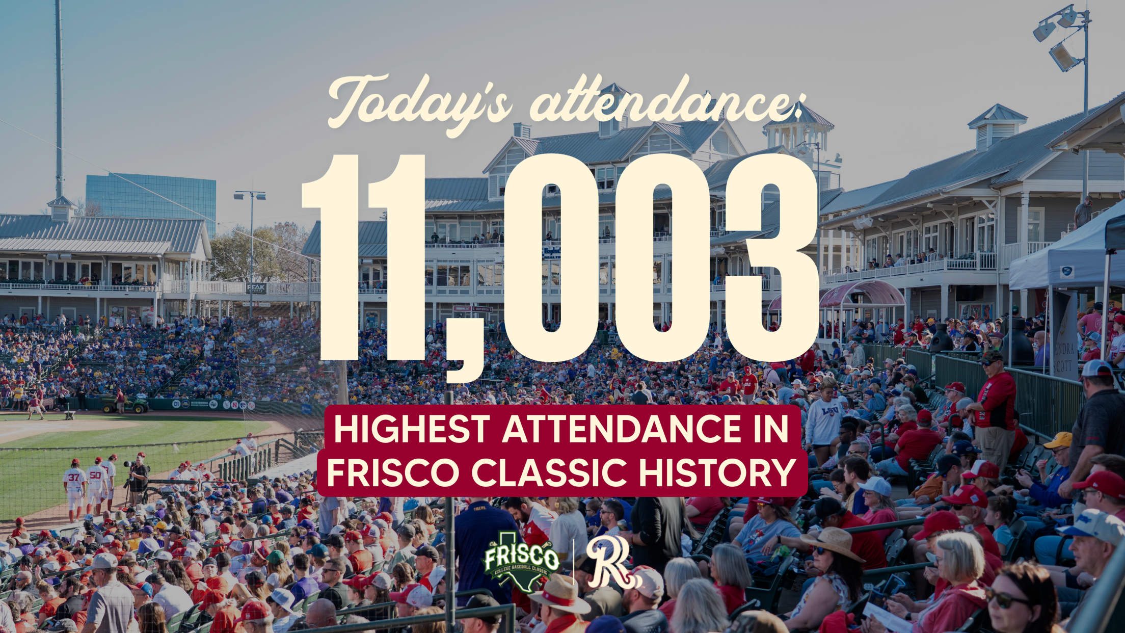 The attendance of 11,003 is the largest crowd in Frisco Classic history, dating back to 2017, and the highest-attended college baseball game in Riders Field history.