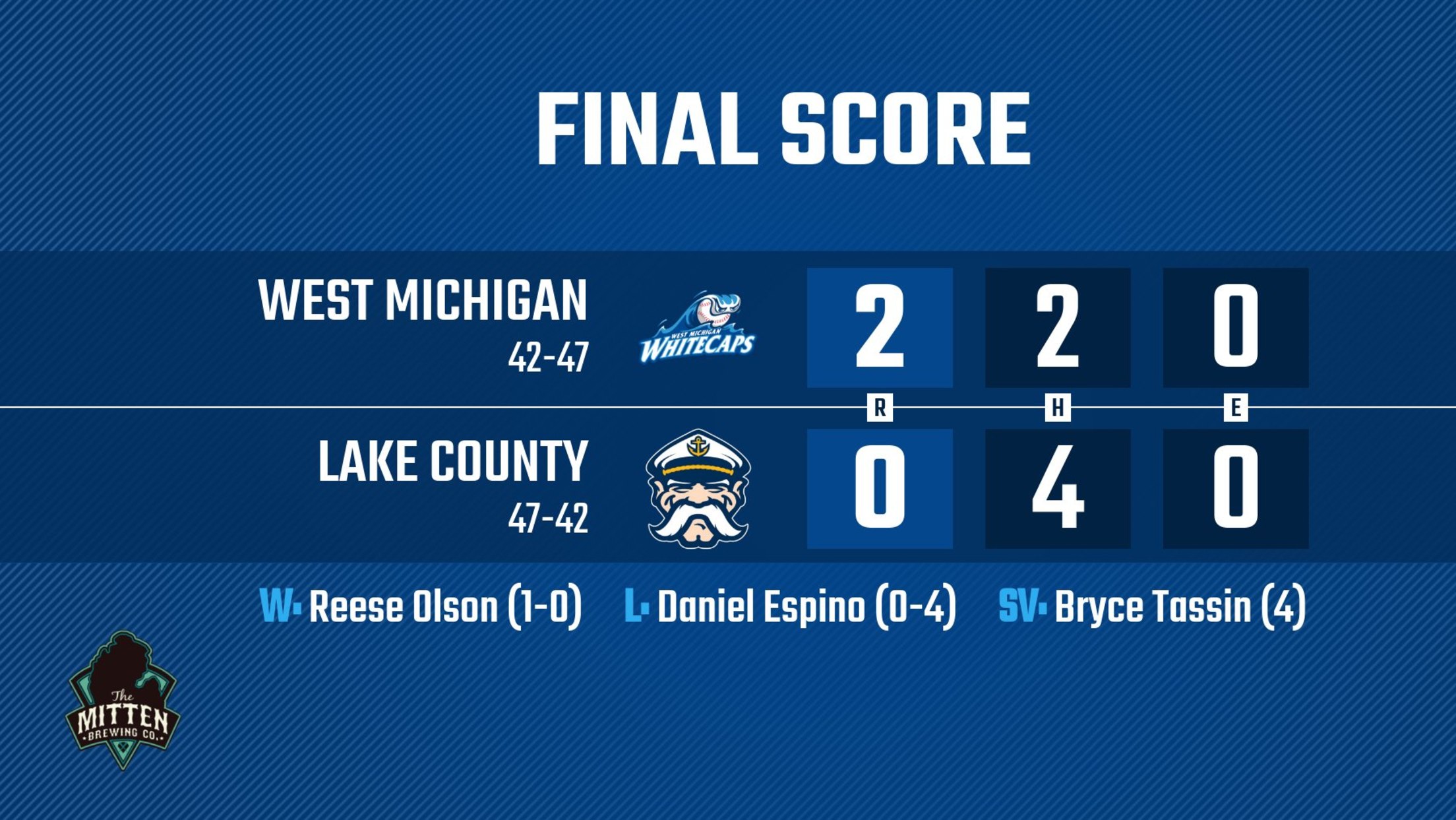 Olson (1-0) picked up his first win as Whitecap in the opener, while Daniel Espino (0-4) suffered a tough-luck loss after giving up just one run in five innings, but with 11 strikeouts. Of the 42 outs recorded by both sides combined, more than half (26) were recorded by strikeout between the two teams. Bryce Tassin pitched two perfect relief innings in the opener to collect his fourth save. In Game 2, Jerson Ramirez (2-0) won his second game of the year out of the bullpen, while Angel Reyes (1-4) suffered his fourth loss. The Whitecaps record moves to 42-47, while Lake County leaves the doubleheader at 47-42. West Michigan needs to win the final game of this series on Sunday to obtain a split of this six-game set.