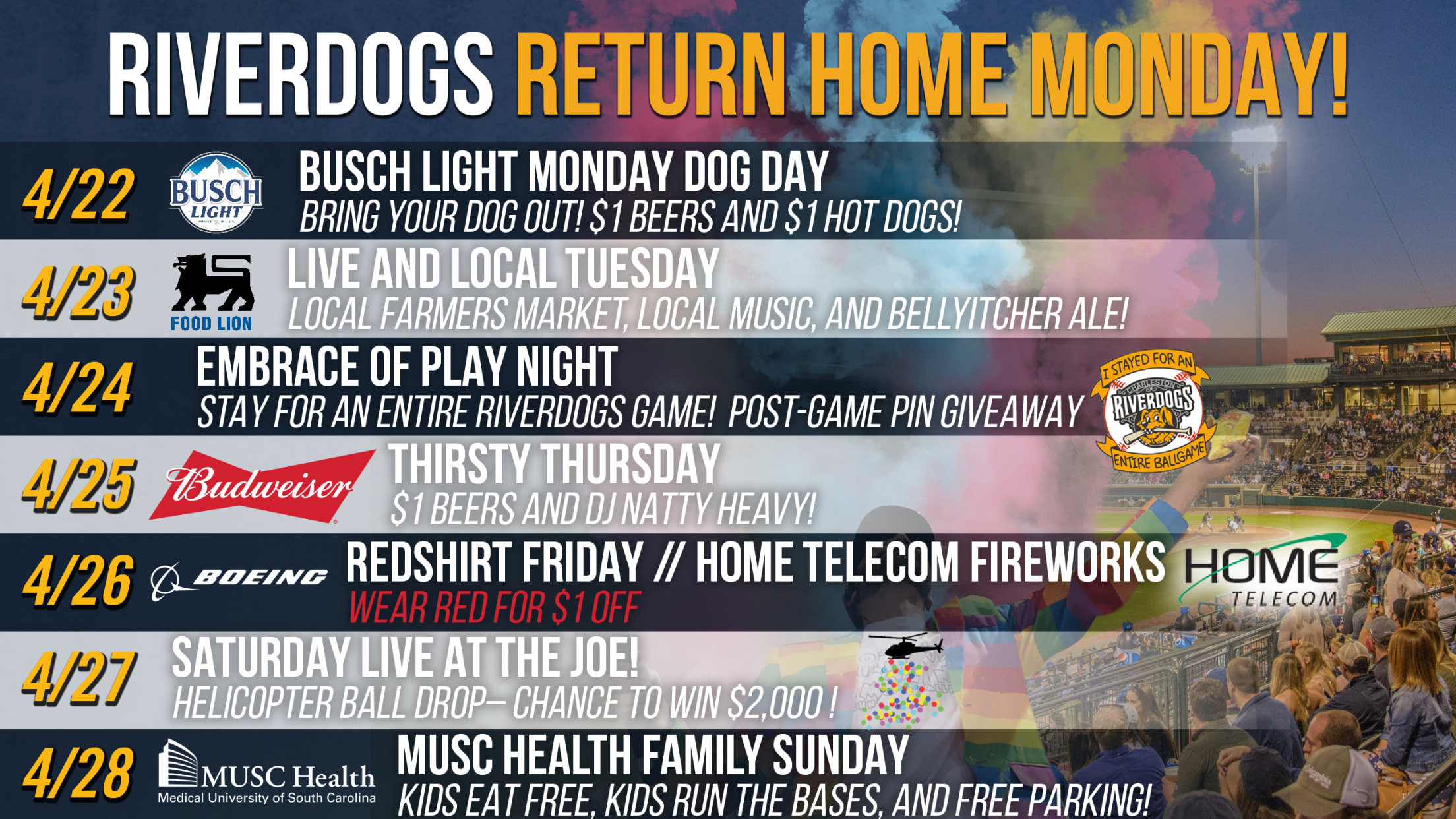 Saturday, April 27, 6:05 p.m.: Helicopter Ball Drop/Naturday: Press your luck and stick around after the game for the first postgame ball drop of the season as part of Saturdays Live at The Joe presented by Mix 95.9 and Fox 24. Following the night's tilt against Columbia, the RiverDogs will deposit thousands of bouncy balls from above in a colorful explosion on the field. One lucky fan has a chance to walk away with a $2,000 grand prize if their numbered ball lands on home plate. As part of the first Naturday of the season, fans can enjoy the RiverDogs' latest frosty beverage, the Naturdays Beer Shake featuring Natty Light over strawberry and vanilla ice cream with fresh squeezed lemon.