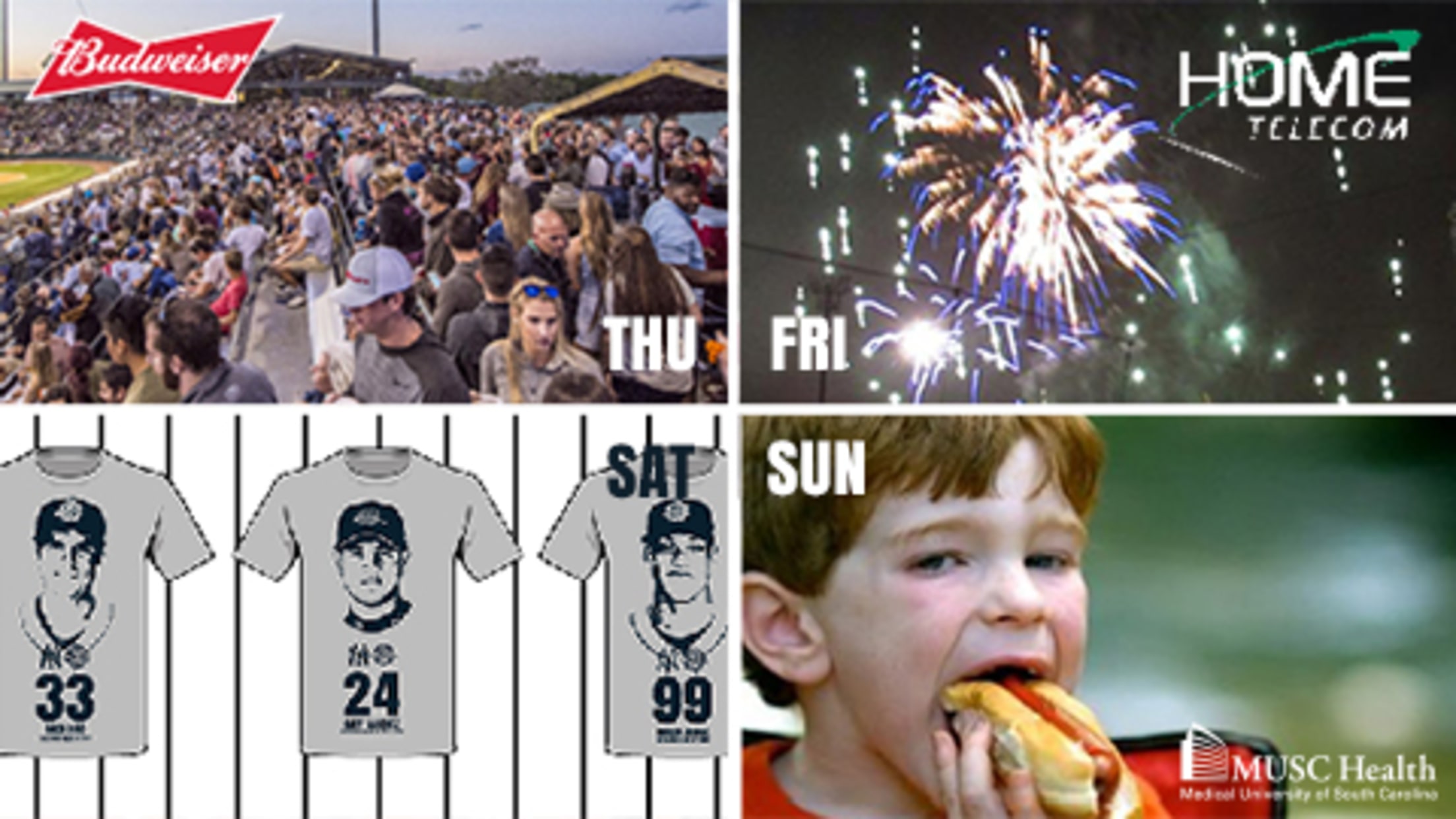 Sunday, May 28, 5:05pm: Planes, Trains, and Automobiles/MUSC Health Family Sundays in the Holy City: Relive your childhood fascination with all things transportation on an evening of family fun at The Joe. Every Sunday is an MUSC Health Family Sunday in the Holy City as the RiverDogs don their specialty Holy City pinstriped uniforms on an evening of family fun in the final game of the first series for the Spinx Battle of the Palmetto State. In partnership with Y102.5, the RiverDogs offer free parking while members of the MUSC Children's Health Kids Club (12 and under) gain free admission, eat free, play pregame catch on the field, and run the bases postgame. Check out classic cars from the Lowcountry Mustang Club at the gate and take a ride on the train on the concourse for even more kid-friendly fun.