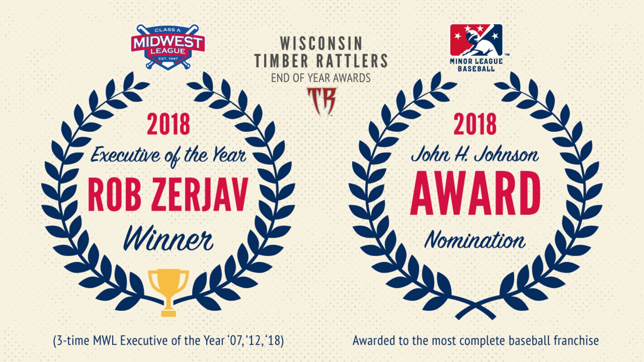 GRAND CHUTE, WI - The Midwest League has given the Wisconsin Timber Rattlers a pair of honors. Team president and general manager Rob Zerjav is the 2018 Executive of the Year for the league and the Rattlers are the Midwest League's nominee for the national John H. Johnson Award.
