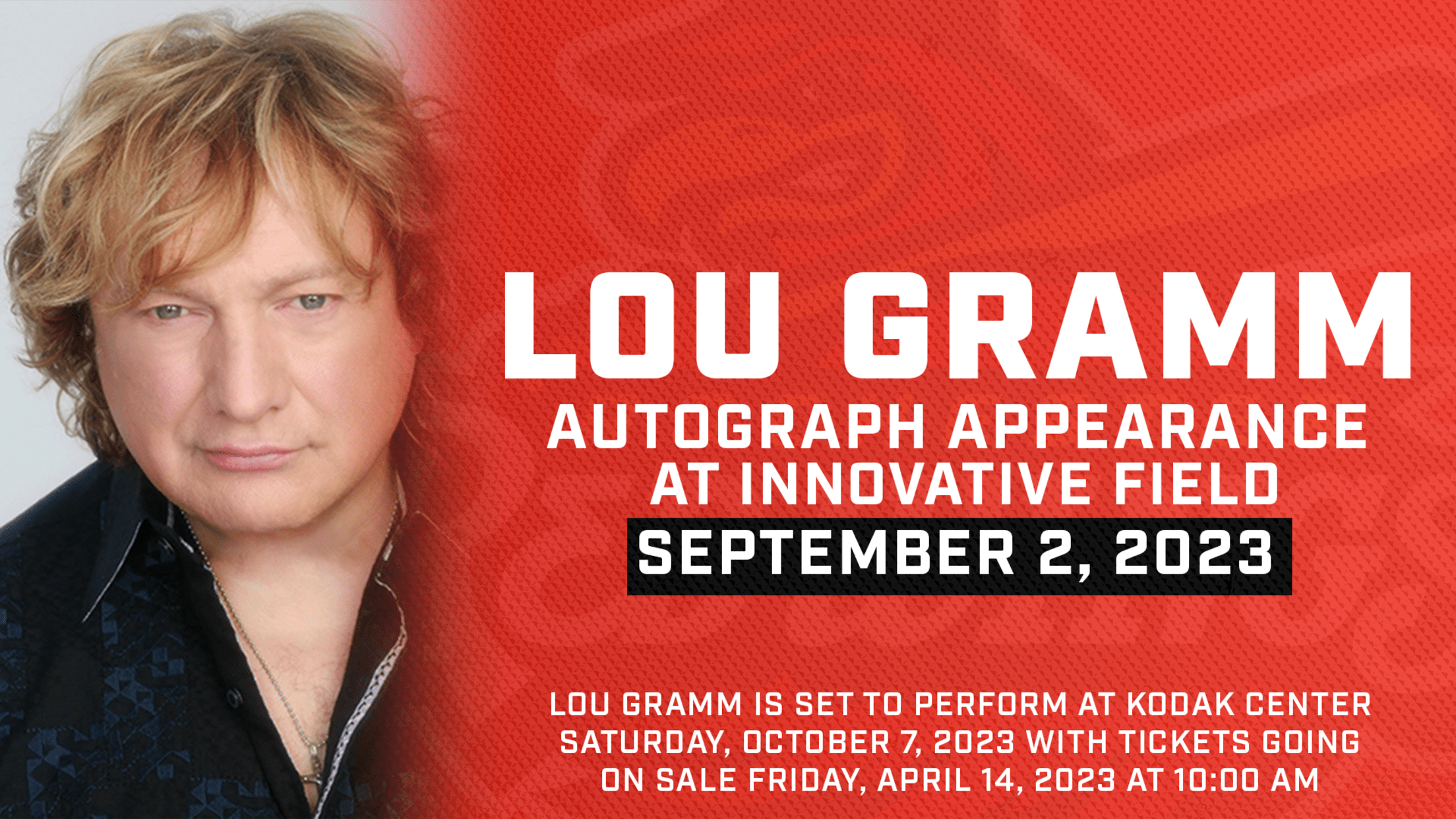 Lou Gramm’s ballpark visit serves as a preview for his upcoming October 7 show at the Kodak Center, featuring his band, the Lou Gramm All Stars. Tickets for the 8:00 pm show start at $30.50 (plus applicable fees) and will go on sale to the general public on Friday, April 14, 2023, at 10:00 am at Ticketmaster.com and the Kodak Center Box Office.