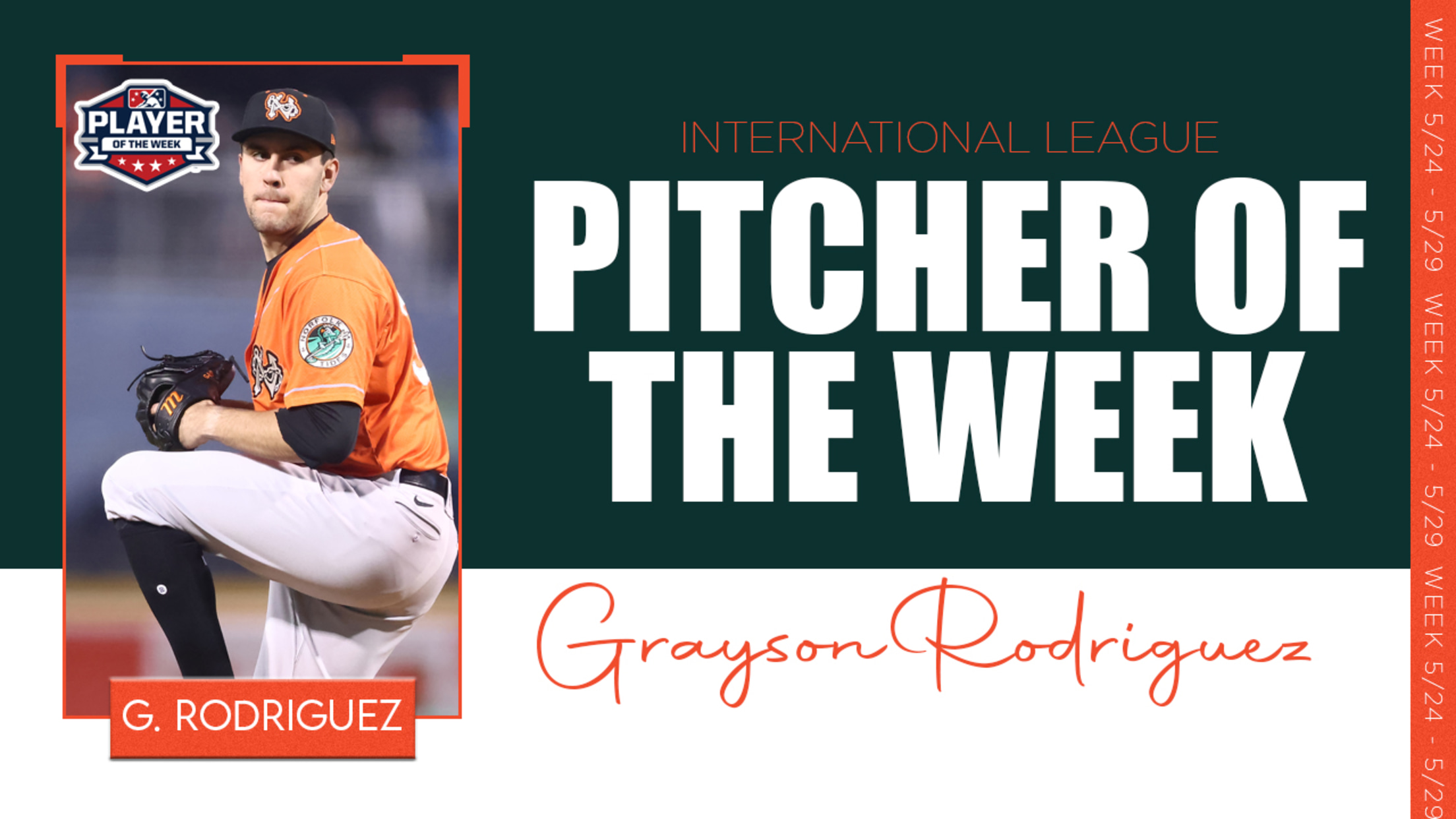 Minor League Baseball today announced the International League’s Player and Pitcher of the Week Awards. Norfolk Tides’ starter Grayson Rodriguez was named Pitcher of the Week, while Omaha infielder Vinnie Pasquantino was named Player of the Week. Rodriguez is currently listed as the probable starter for the Tides tomorrow night, Wednesday, June 1. It’s the second time he’s won a Pitcher of the Week award, winning it with Single-A Delmarva of the South Atlantic League in 2019. .