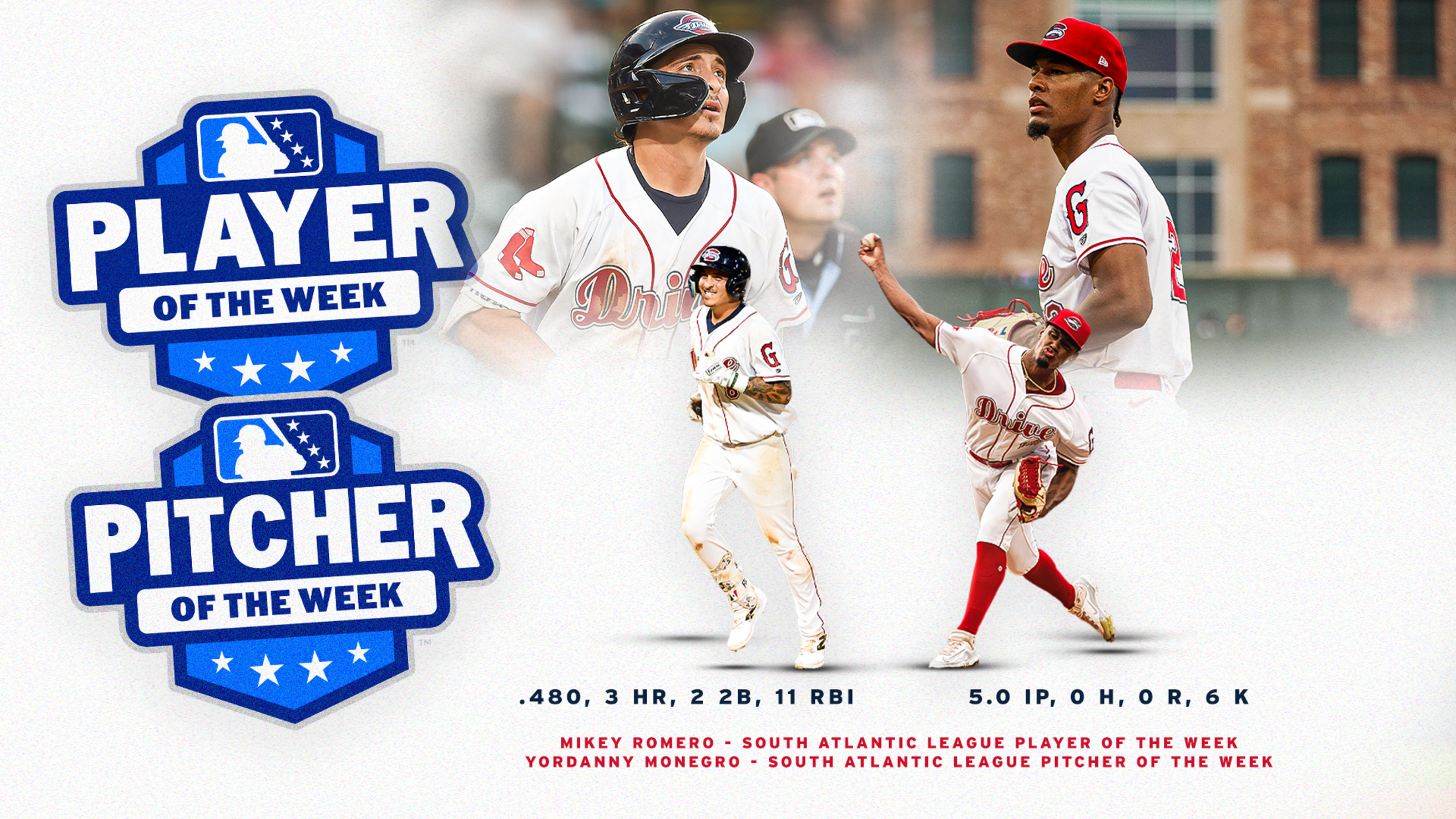 Romero’s award marks the 37th time a Drive player has earned Player of the Week honors, which spans a collective 32 players. Monegro’s award marks the 19th time a Drive pitcher has won Pitcher of the Week honors.