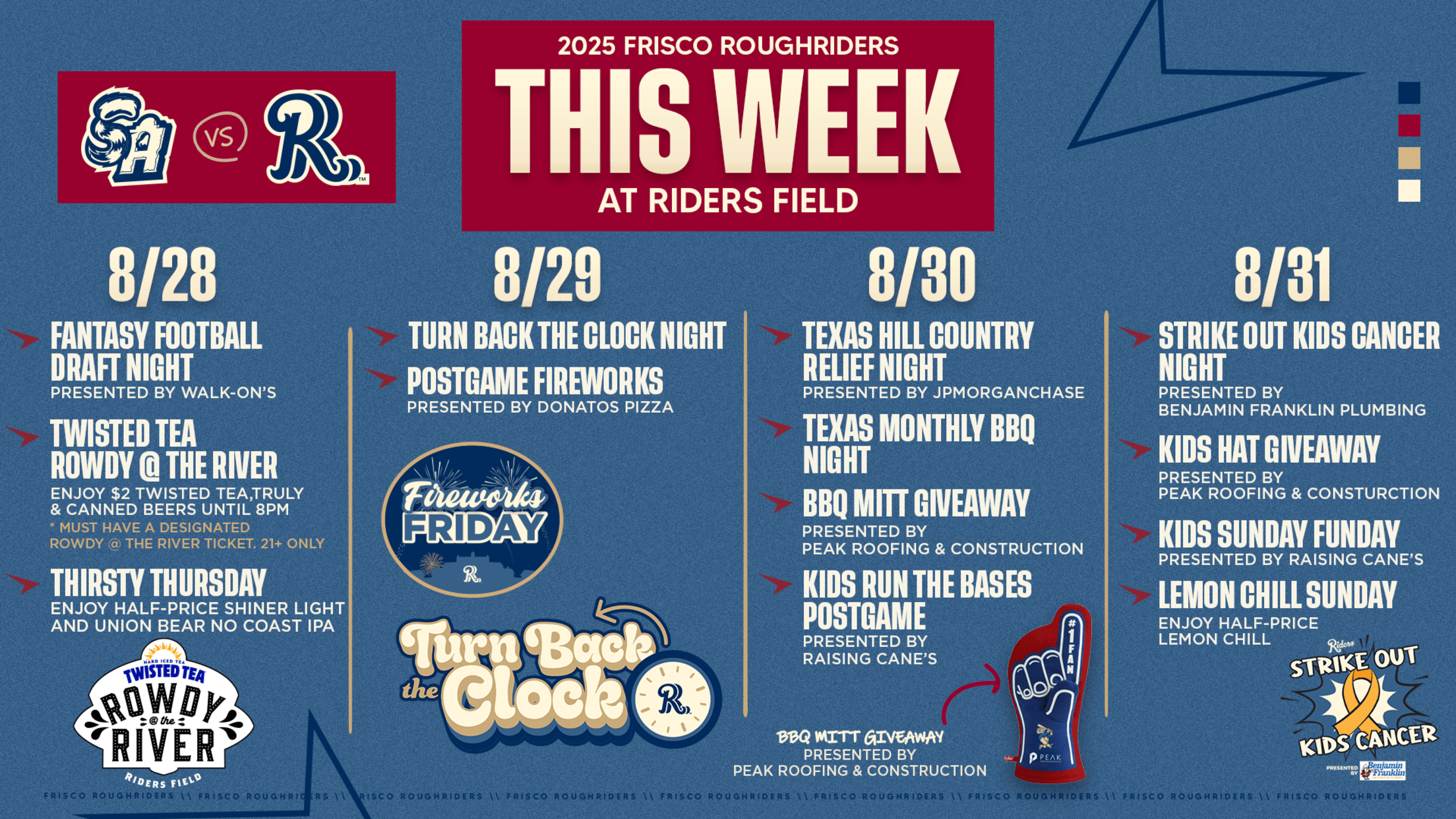 FRISCO, Texas (August 20, 2025) – The Frisco RoughRiders are thrilled to announce a packed slate of promotions for six games against the San Antonio Missions (Padres affiliate) on Tuesday, August 26th through Sunday, August 31st from Riders Field. Buy Tickets Here Check out the ticket specials here and take
