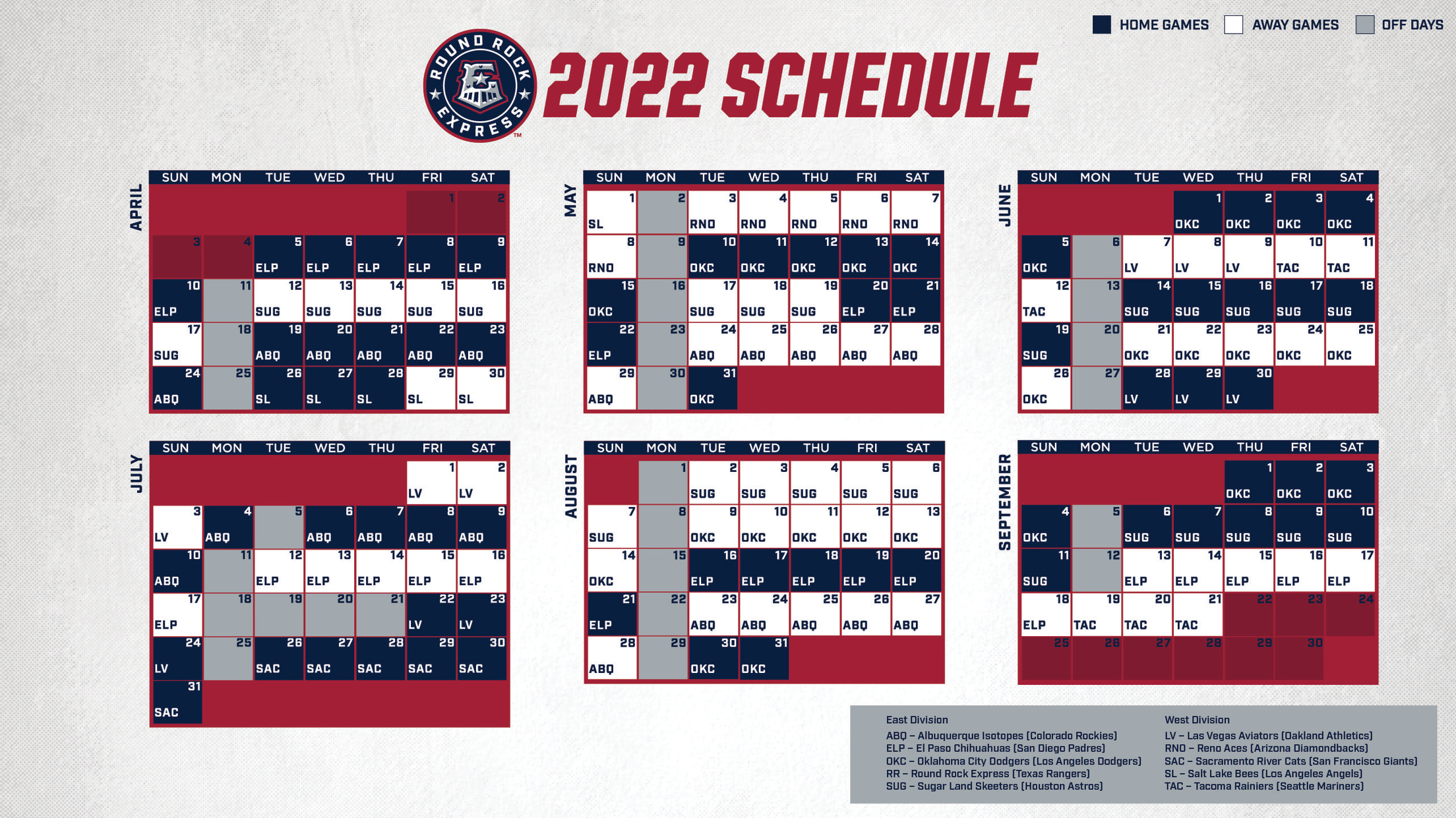 Round Rock opens the 2022 campaign with a six-game series against the El Paso Chihuahuas (San Diego Padres affiliate) from Tuesday, April 5 – Sunday, April 10. The Chihuahuas return to Dell Diamond for a quick three-game set from Friday, May 20 – Sunday, May 22 and again for a six-game showdown from Tuesday, August 16 – Sunday, August 21. Round Rock takes two trips to Southwest University Park in El Paso, first from Tuesday, July 12 – Sunday, July 17 then again from Tuesday, September 13 – Sunday, September 18.