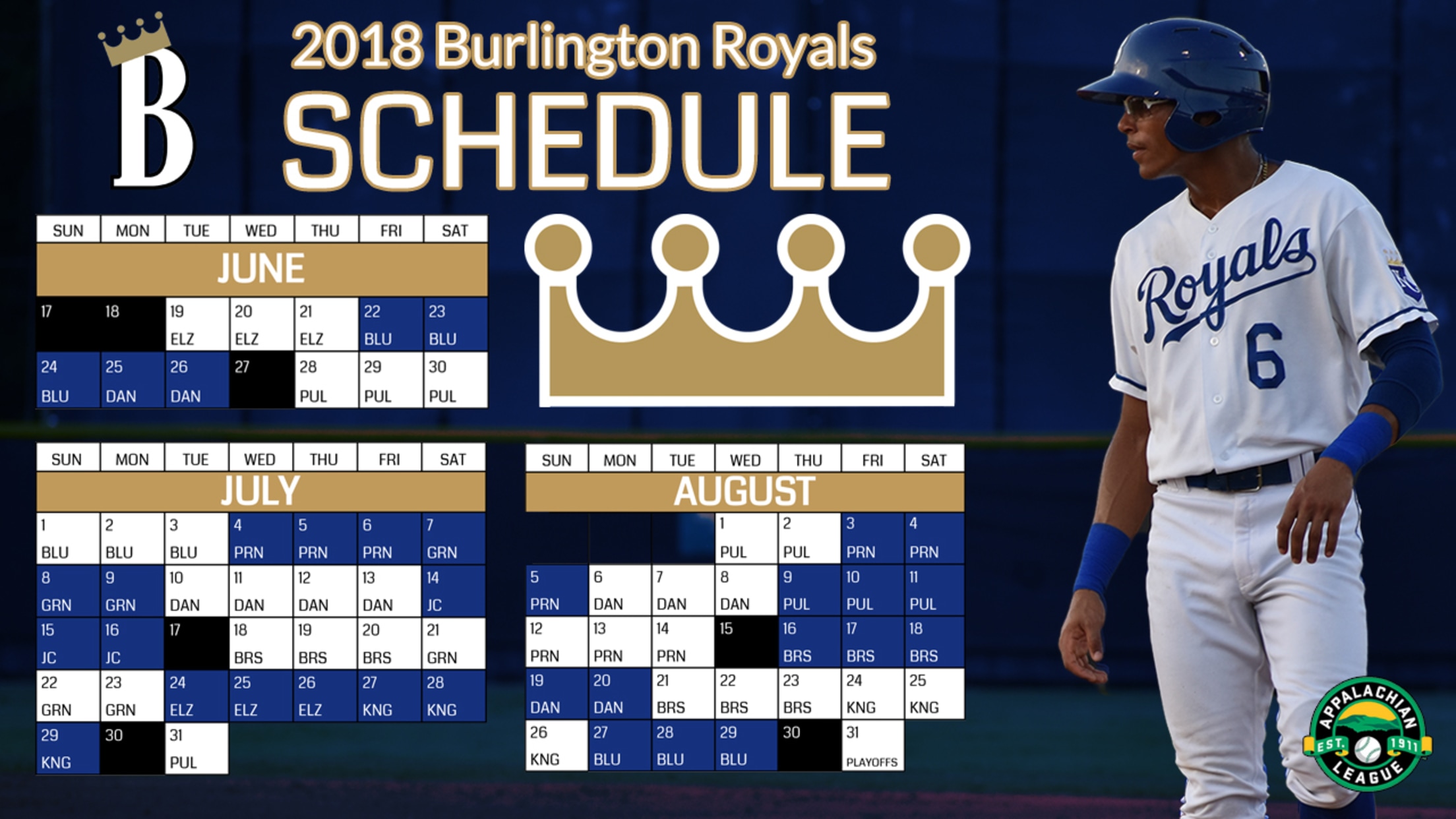 Burlington, NC -The Burlington Royals released their 2018 regular season schedule on Tuesday. The regular season starts on the road at the defending Appalachian League Champion Elizabethton Twins on Tuesday, June 19th, and the home opener for the Royals is Friday, June 22nd against the Bluefield Blue Jays.The Royals are