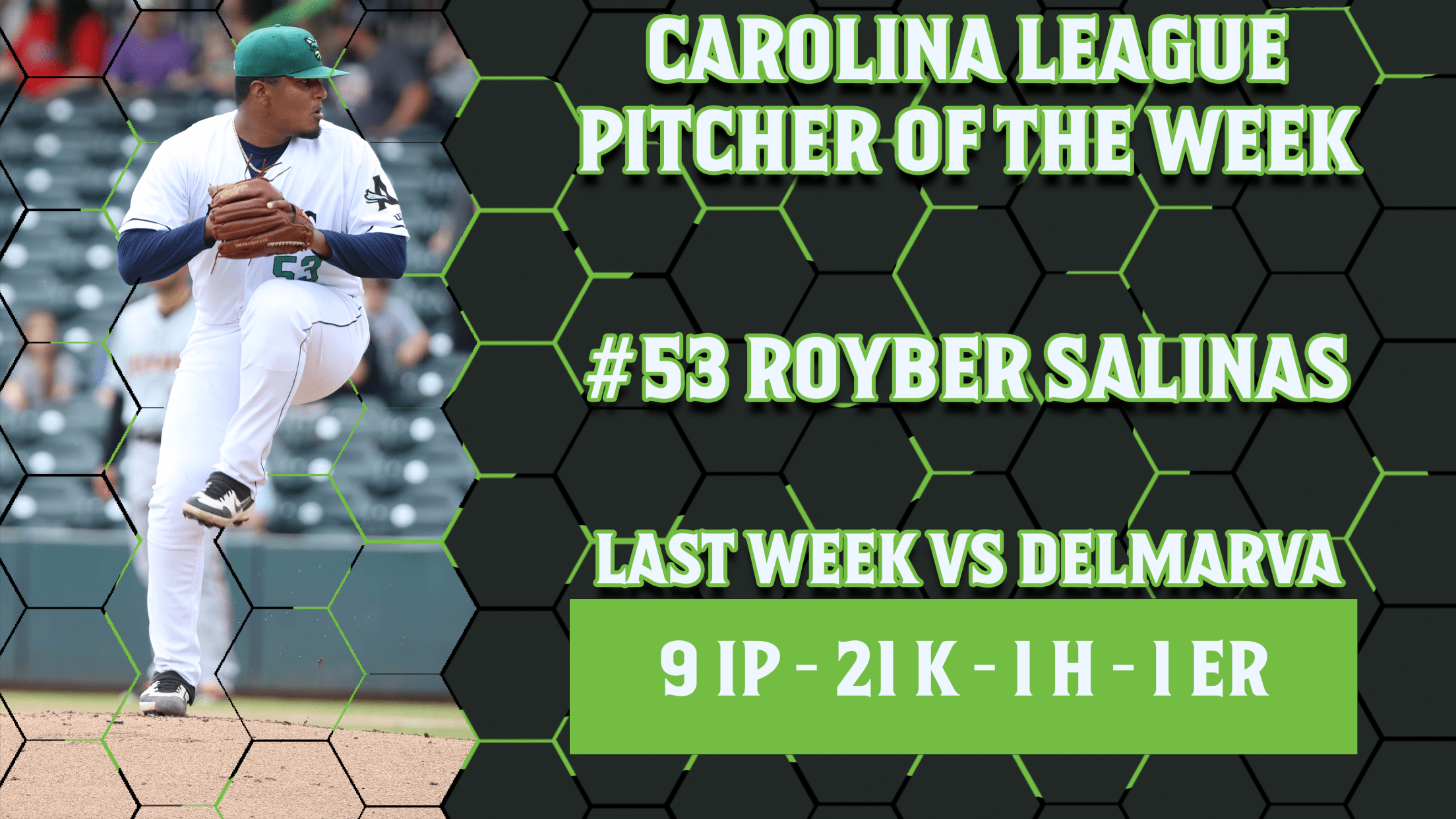 *NORTH AUGUSTA, SC: *Augusta GreenJackets starting pitcher, Royber Salinas was named the Pitcher of the Week in the Carolina League for the second time this season for the week of April 25-May 1. The right-hander made two starts in the previous series against the Delmarva Shorebirds and was lights out in both of them.